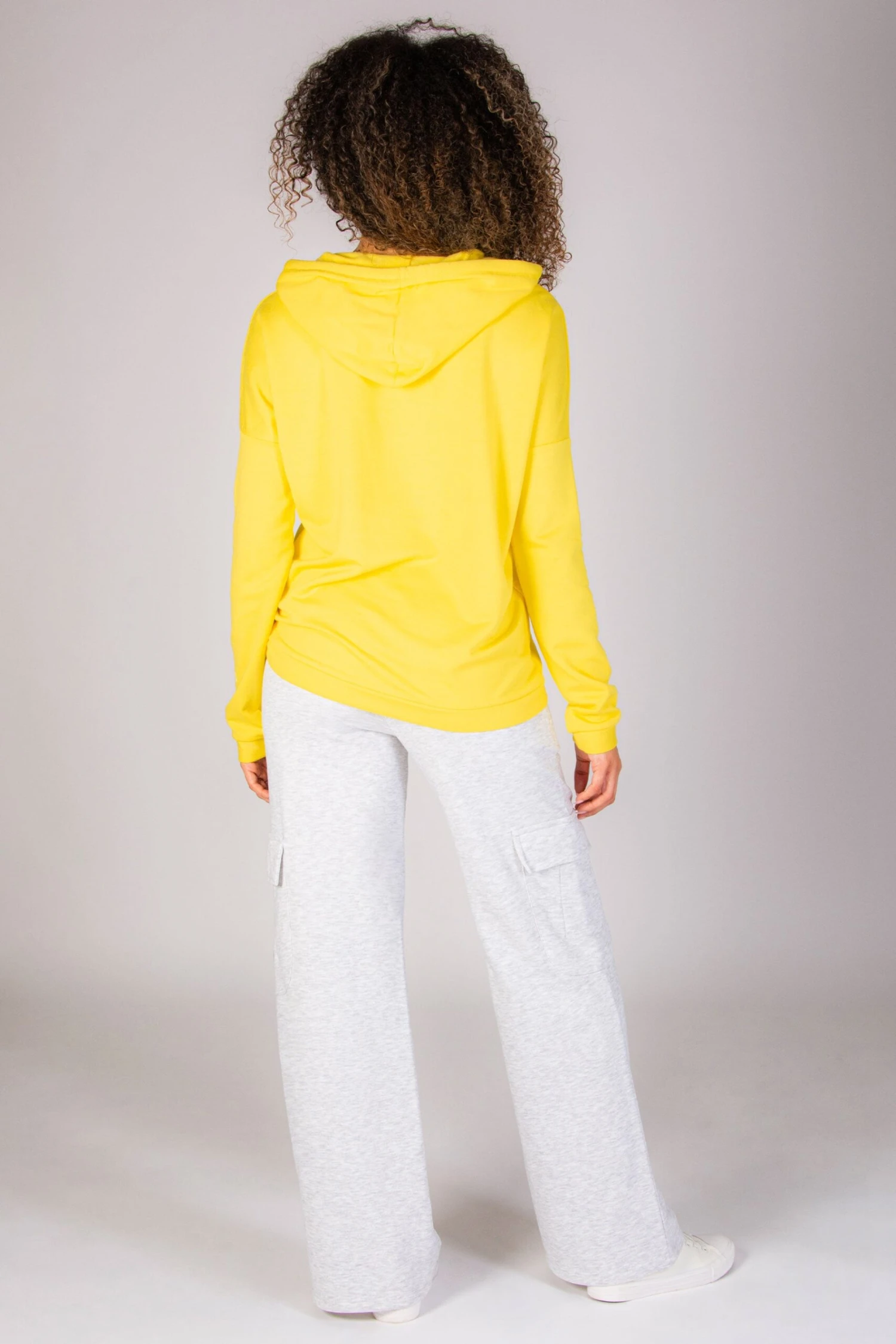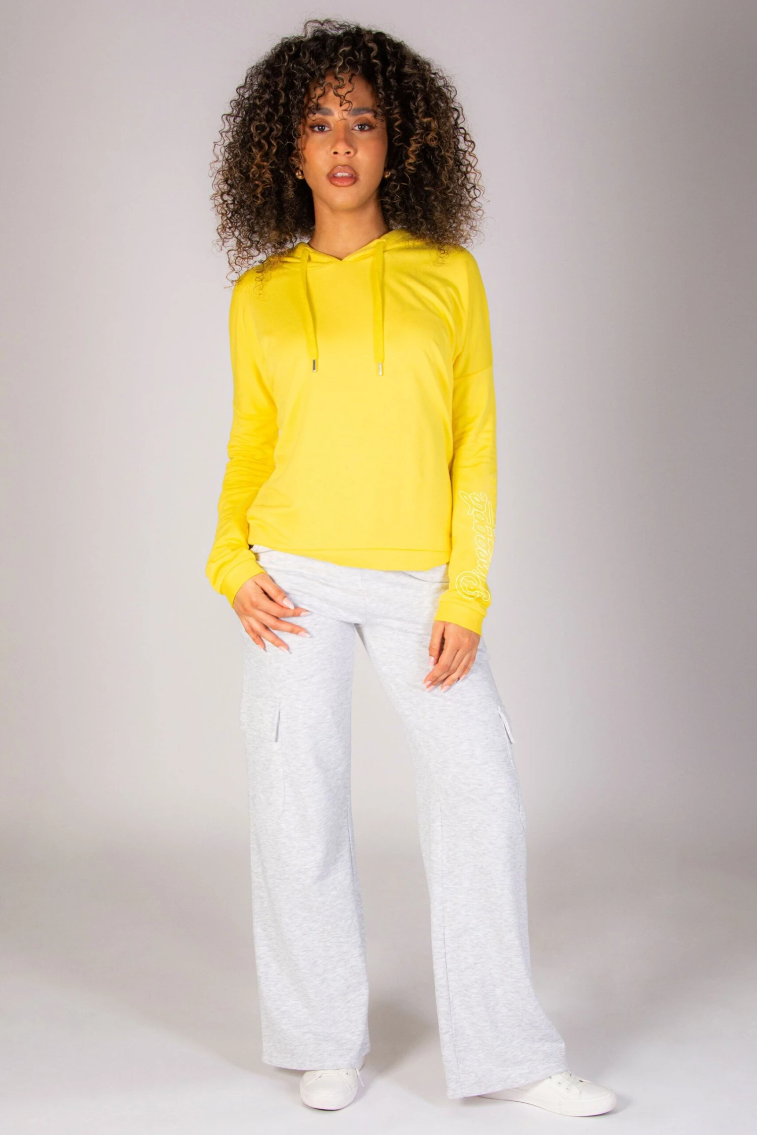 Model is wearing size Small with Pineapple Logo Dip Hem Hoodie in Yellow.