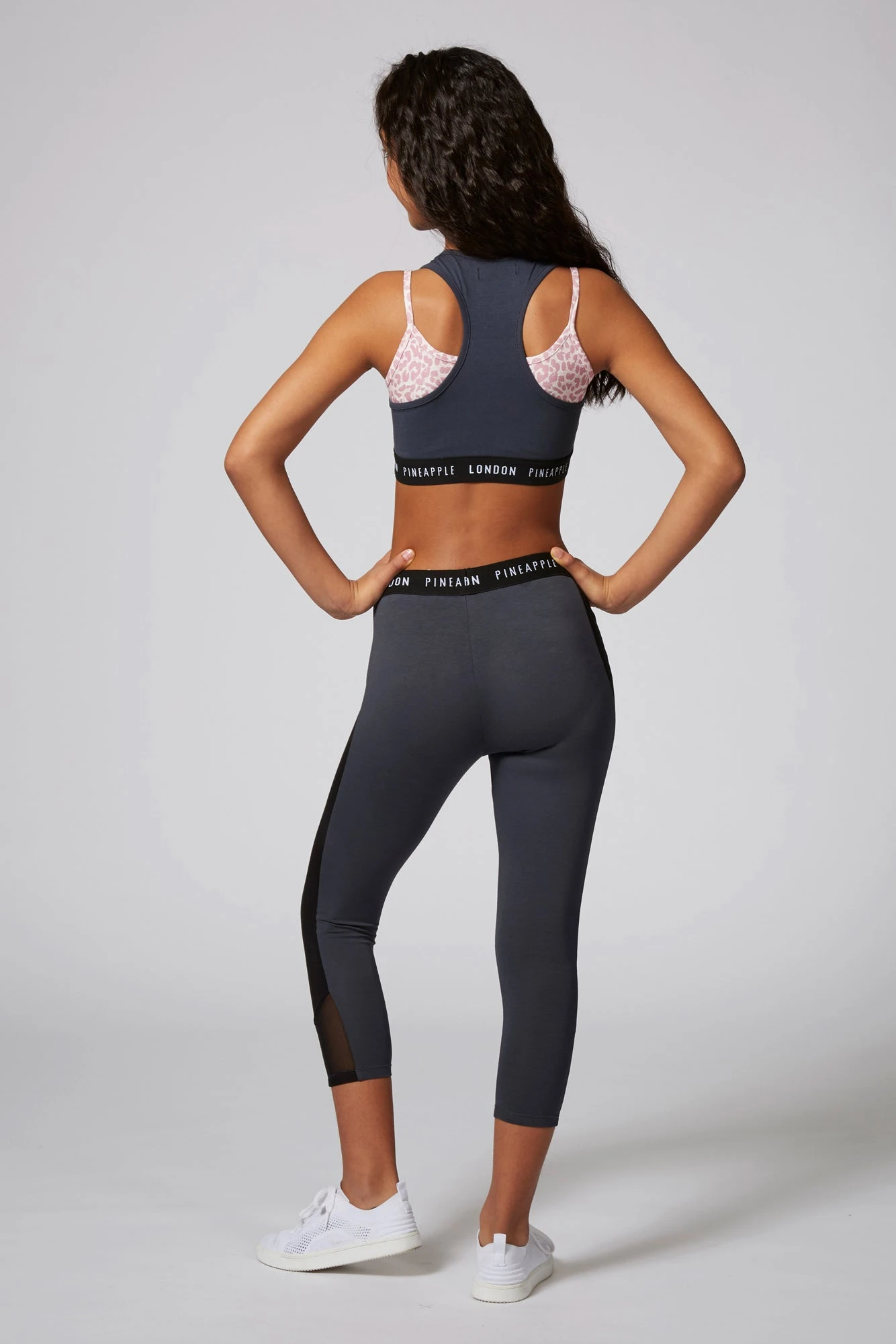The Pineapple dance black leggings for girls who like to dress in style has a foil print logo, branded jacquard elastic waistband, contrast charcoal side panel inserts, and mesh panels at the calves.