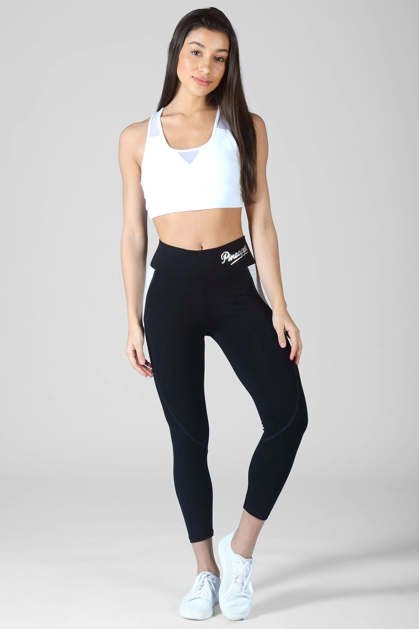Women’s classic Pineapple black cropped leggings with sporty contrast grey colour back panel plus curved back seams for a more customised and flattering fit. The deep waistband gives these capri-style leggings a secure and comfortable fit ideal for light workouts or yoga class.