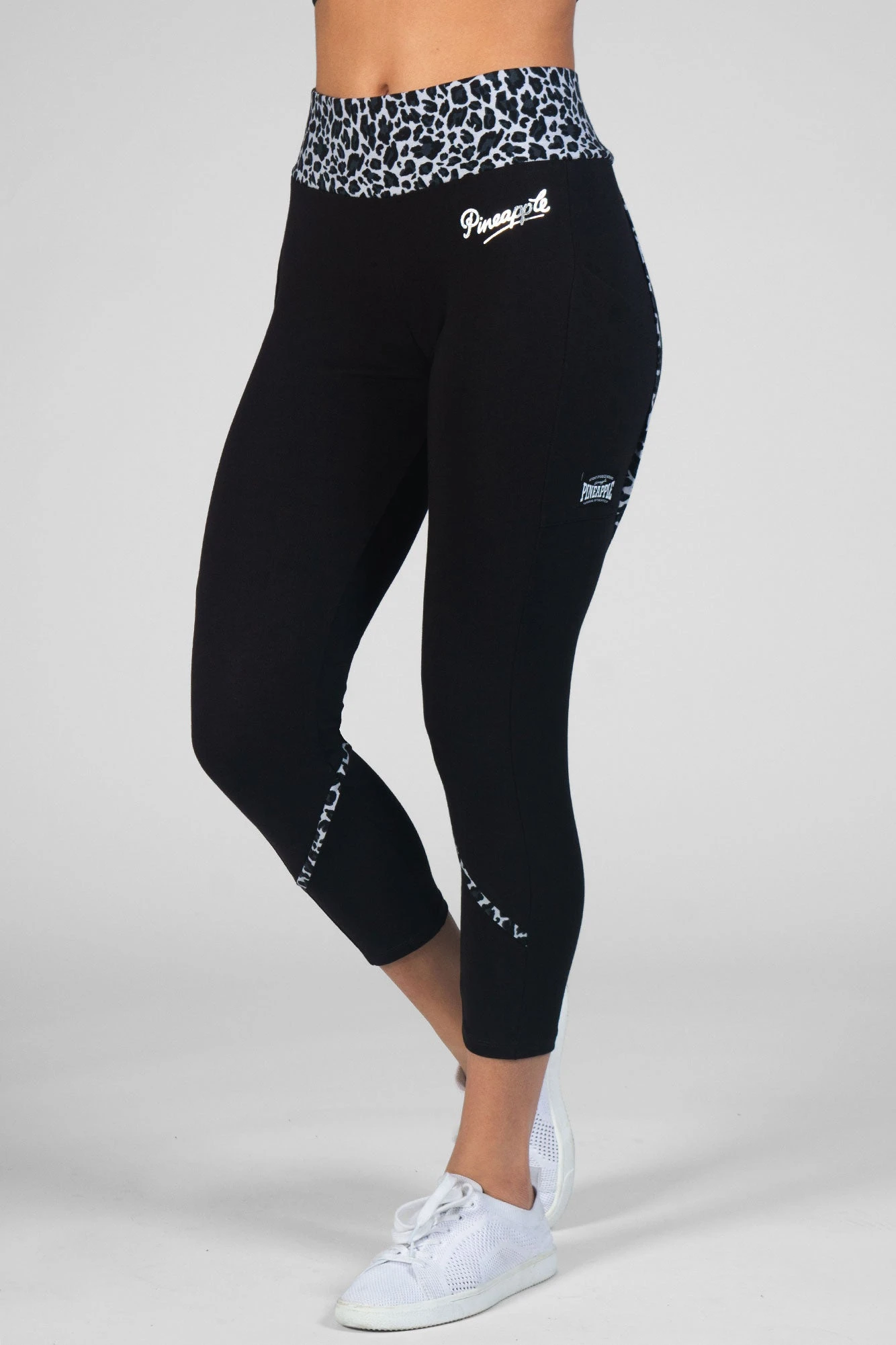 Women’s black cropped leggings with a leopard print piping detail. The fitted Pineapple leggings have functional side pockets and a deep waistband for a secure and comfortable fit.