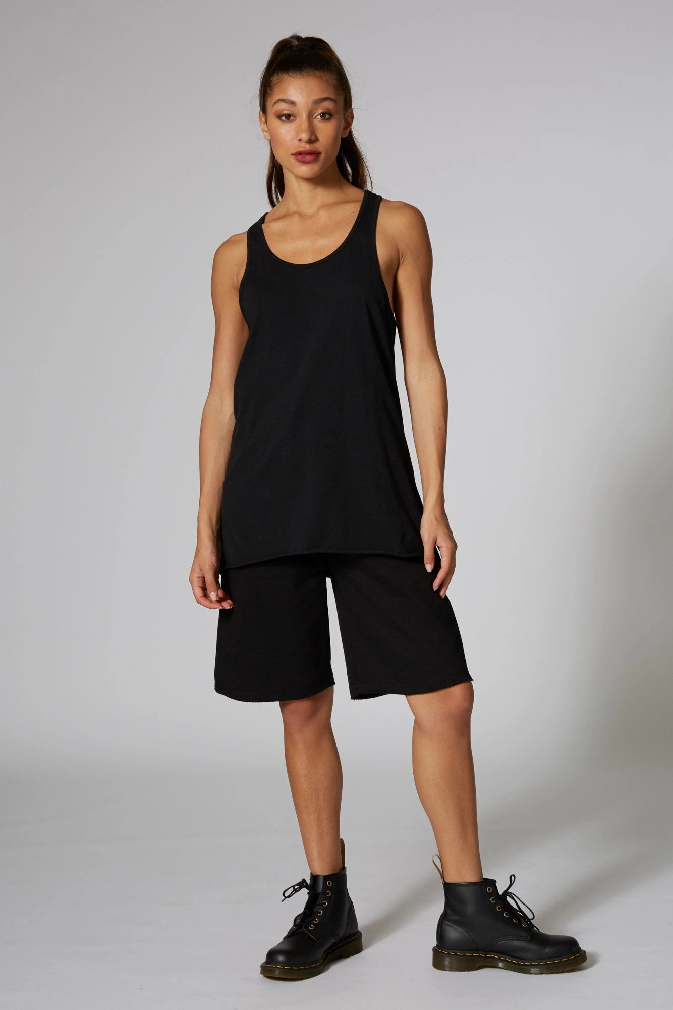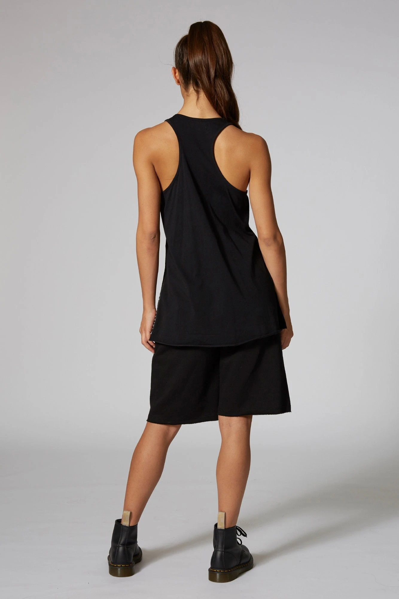 Relaxed cut-off track pants in cotton fleece, with elasticated waist with drawcord tie. The shorts have raw edge hems and a discreet woven logo badge on back.