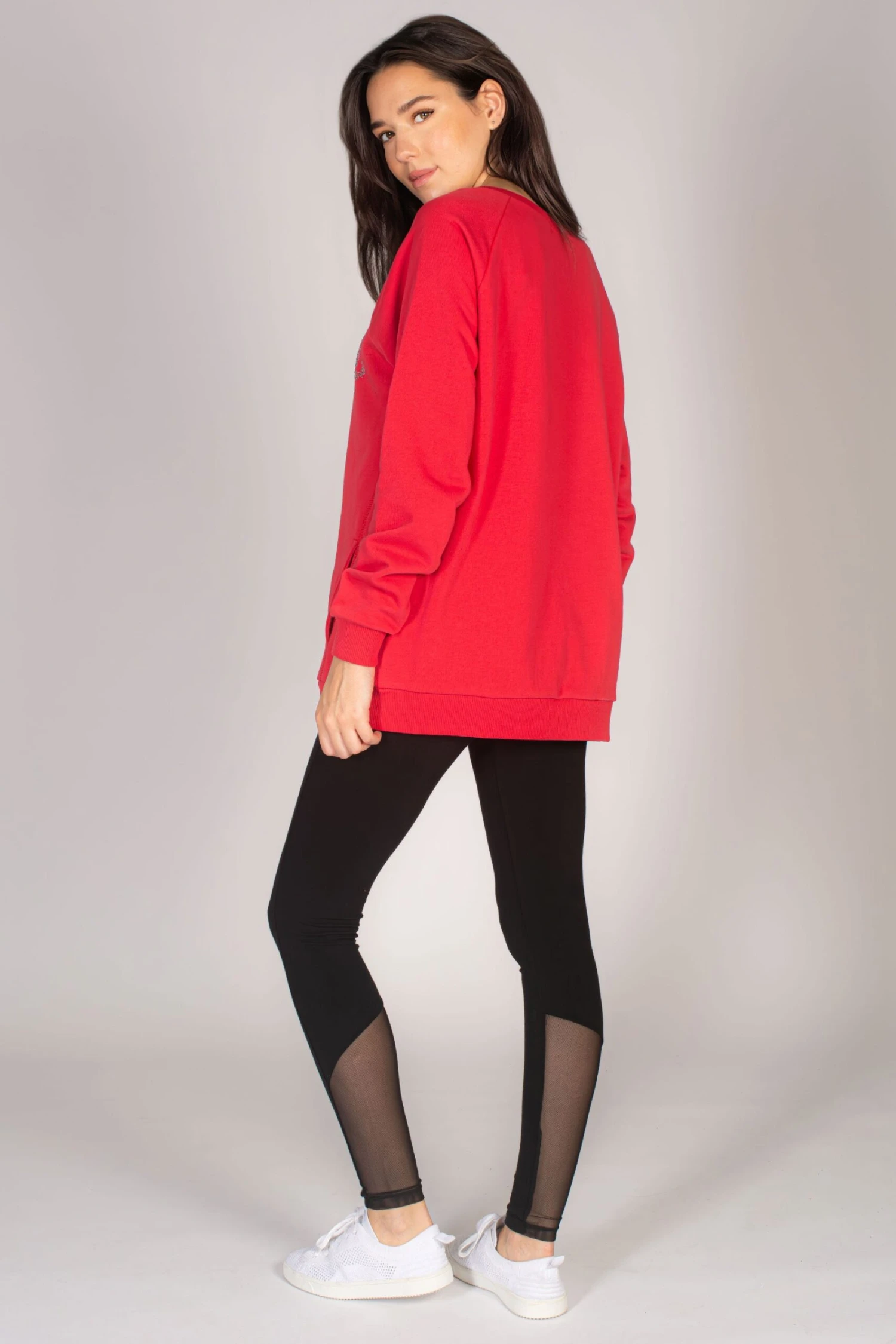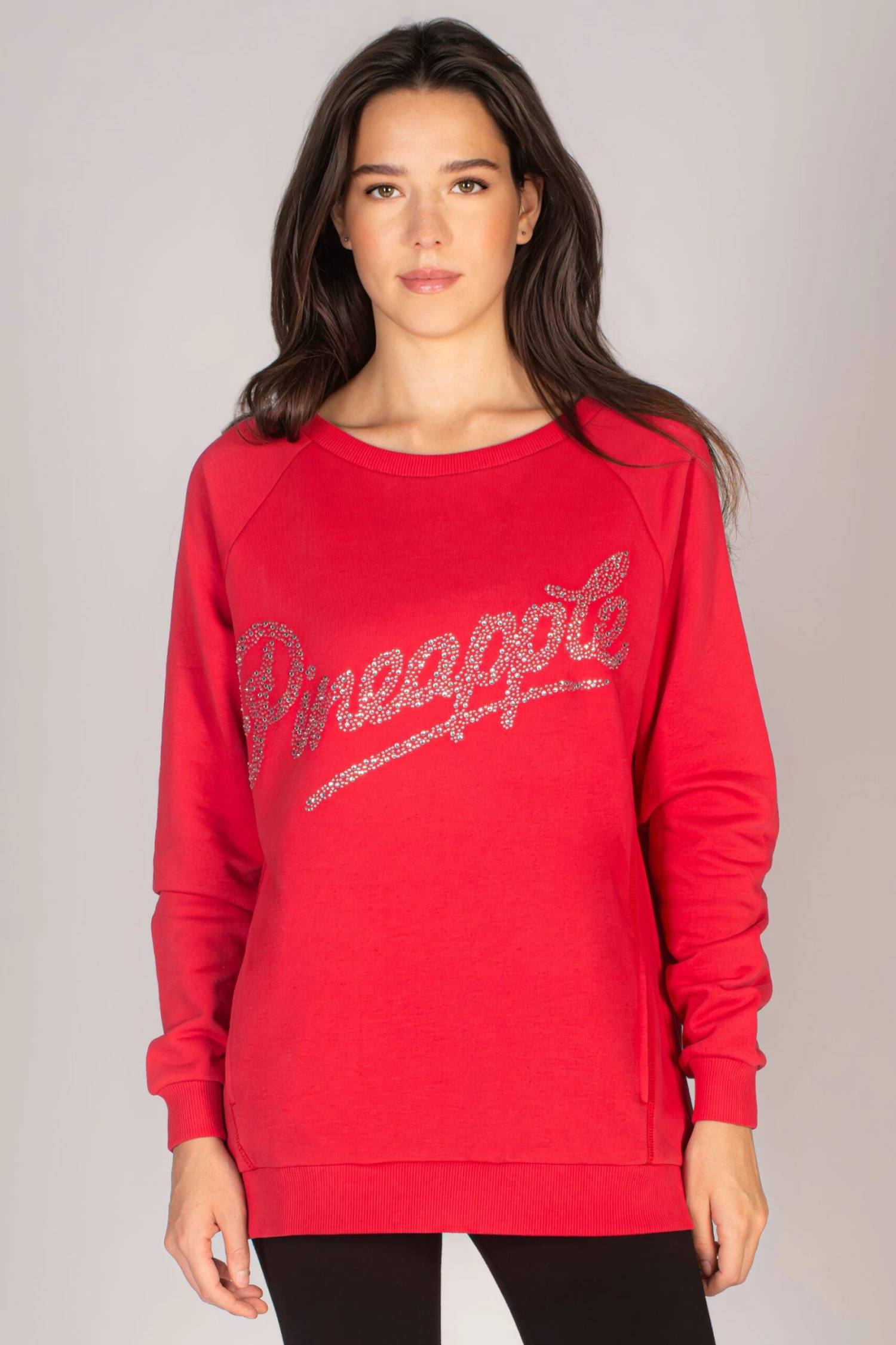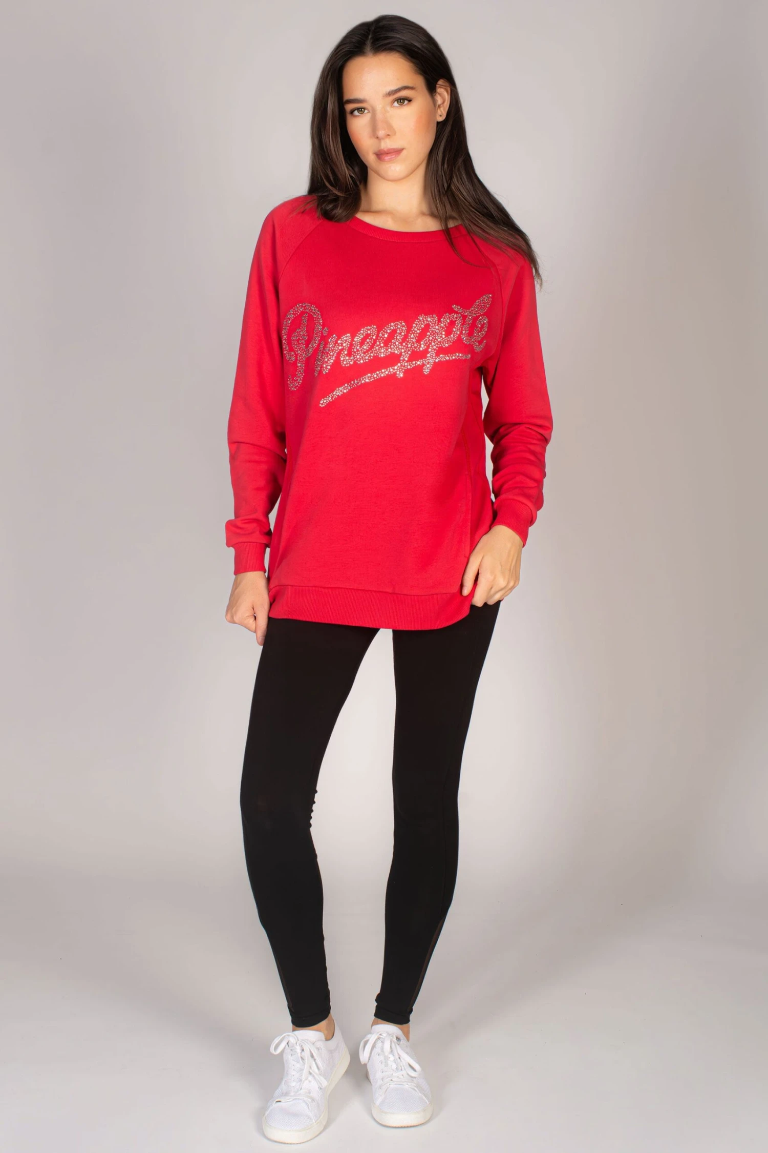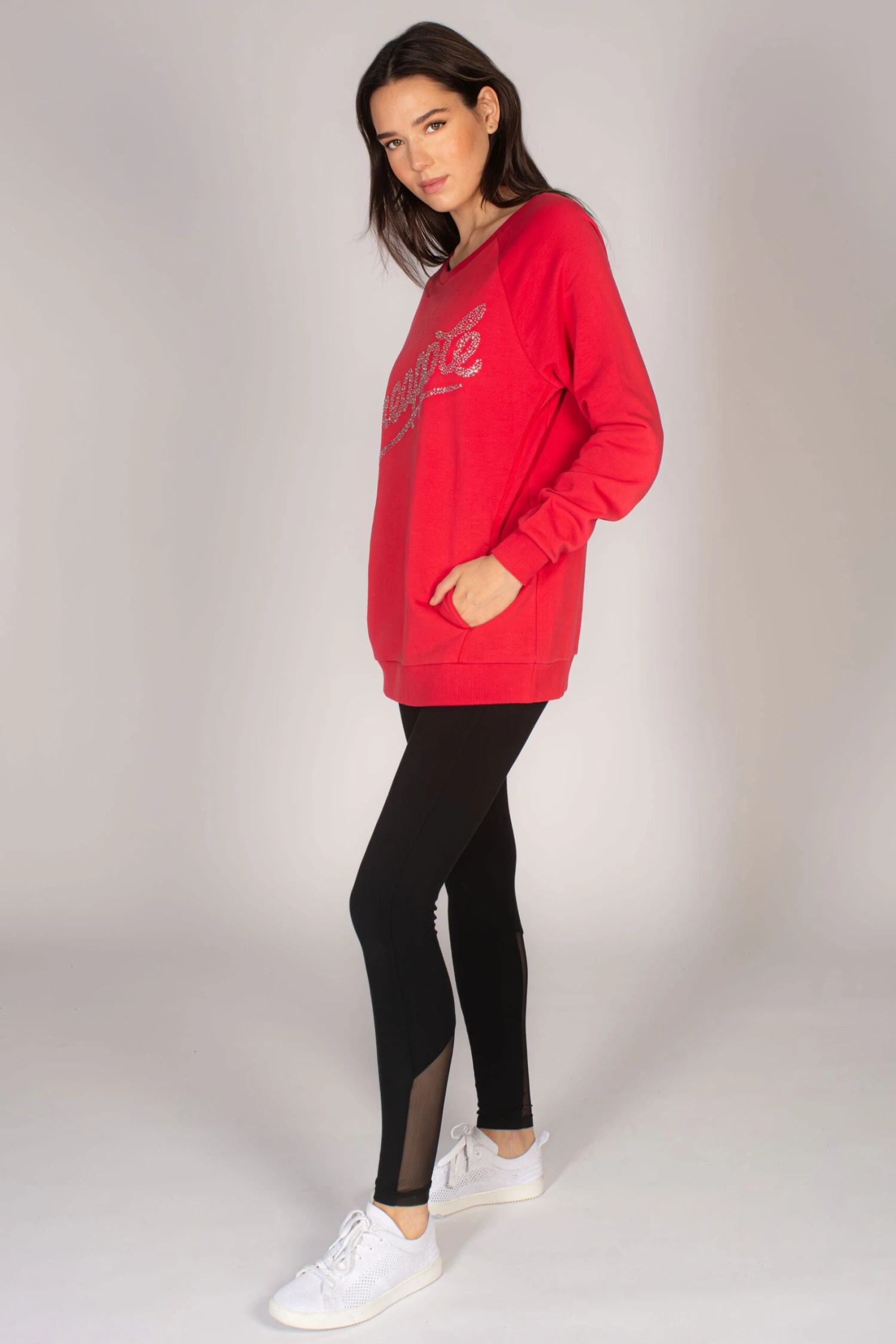 Guaranteed comfort in the oversized sweater with studded logo print across the chest for added glam. Raglan seams and forward placed side seams give structure, with a concealed side pockets and ribbed hem and cuffs.