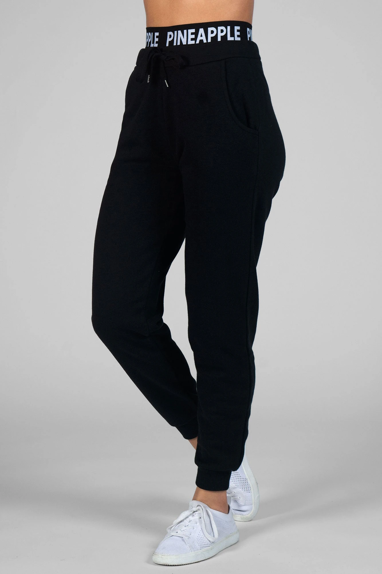 Buy the warmest Pineapple black fleece track pants with a great fit for lounging and casual wear. Contrast ‘PINEAPPLE’ print on a super soft elasticated waistband and drawcord tie that allow you to wear these as you like. Front pockets and elasticated rib cuffs give these trousers a finished look you will be happy to wear.