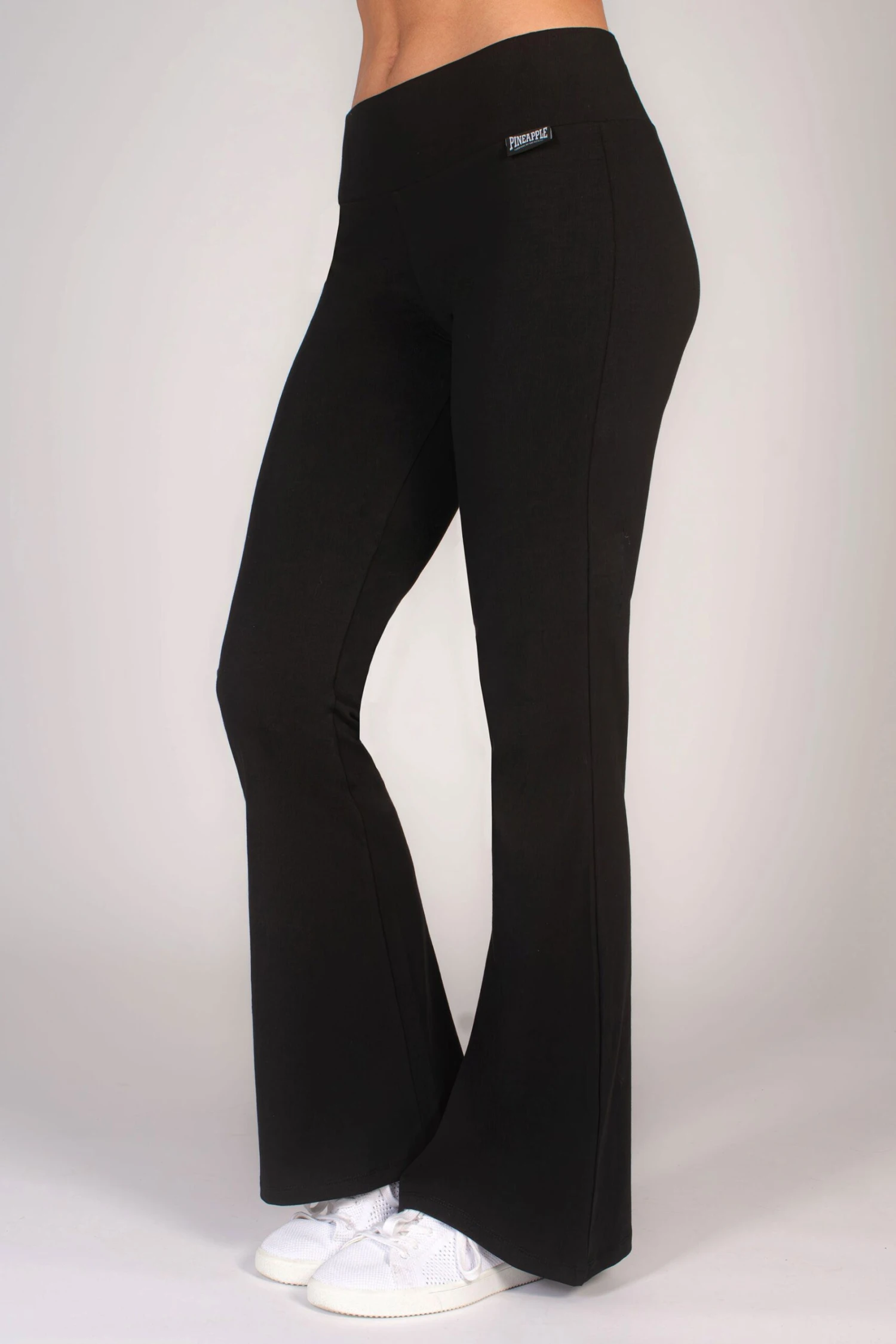 One of our studio essentials! Signature full-length flared jersey trousers in black, great for low-impact workouts, yoga sessions, and dance classes. With superb stretch for a comfy relaxed fit, these flared pants are made to suit everyone. Featuring a stomach flattening waistband and delicate Pineapple branding at the hip, this piece can be easily mixed and matched to any of our essential dance tops.Â