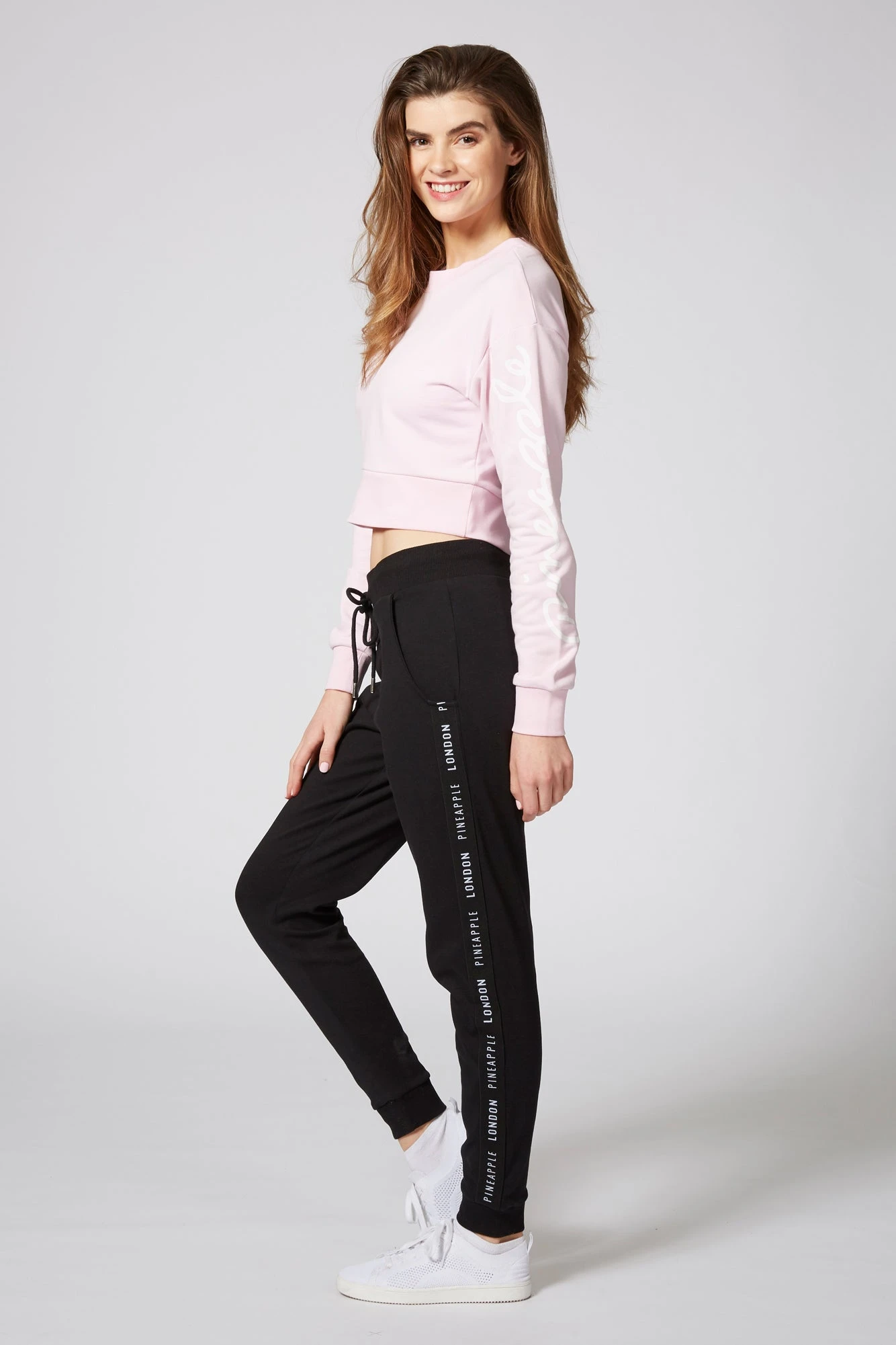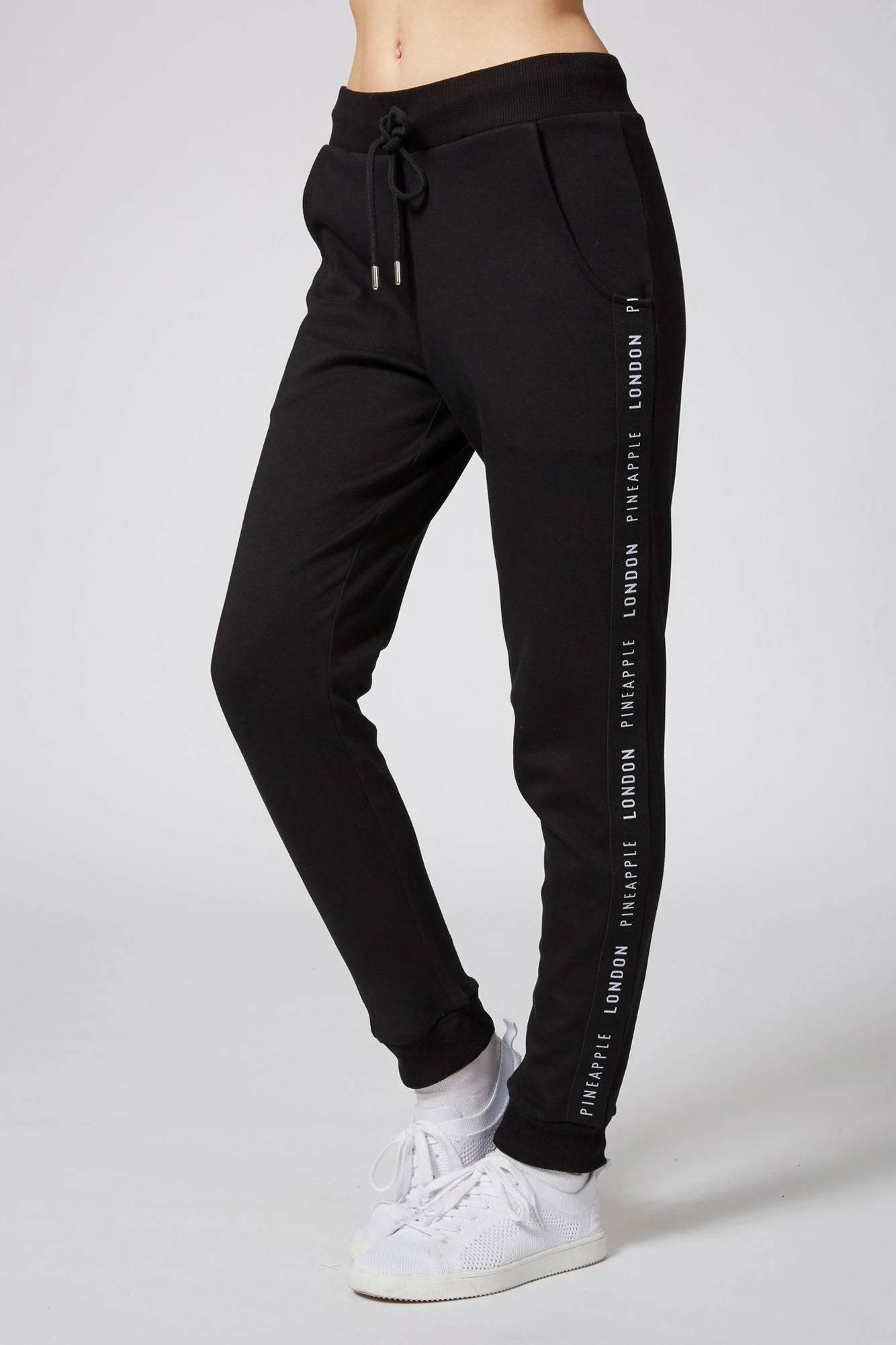 Smart cotton shaped joggers with branded ‘PINEAPPLE LONDON’ tape running down both legs. Ribbed drawcord waist with woven badge on the back, front pockets, and ribbed cuffs.