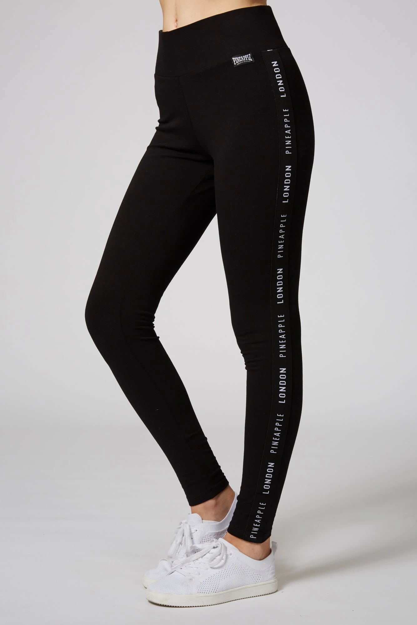 #bringthestudioshome in these classic leggings updated with branded ‘PINEAPPLE LONDON’ elastic tape running down the sides of both legs. Move comfortably with a deeper elasticated waistband, with added woven badge detail on hip.