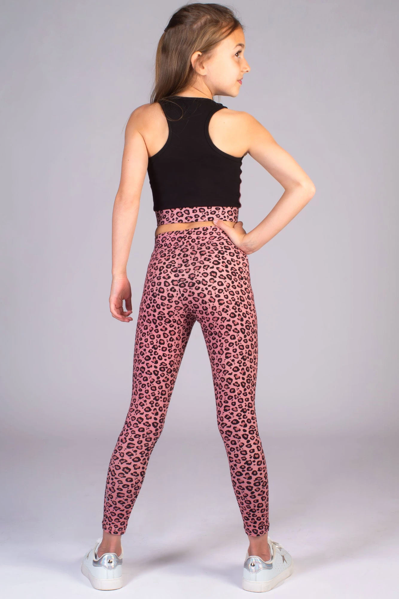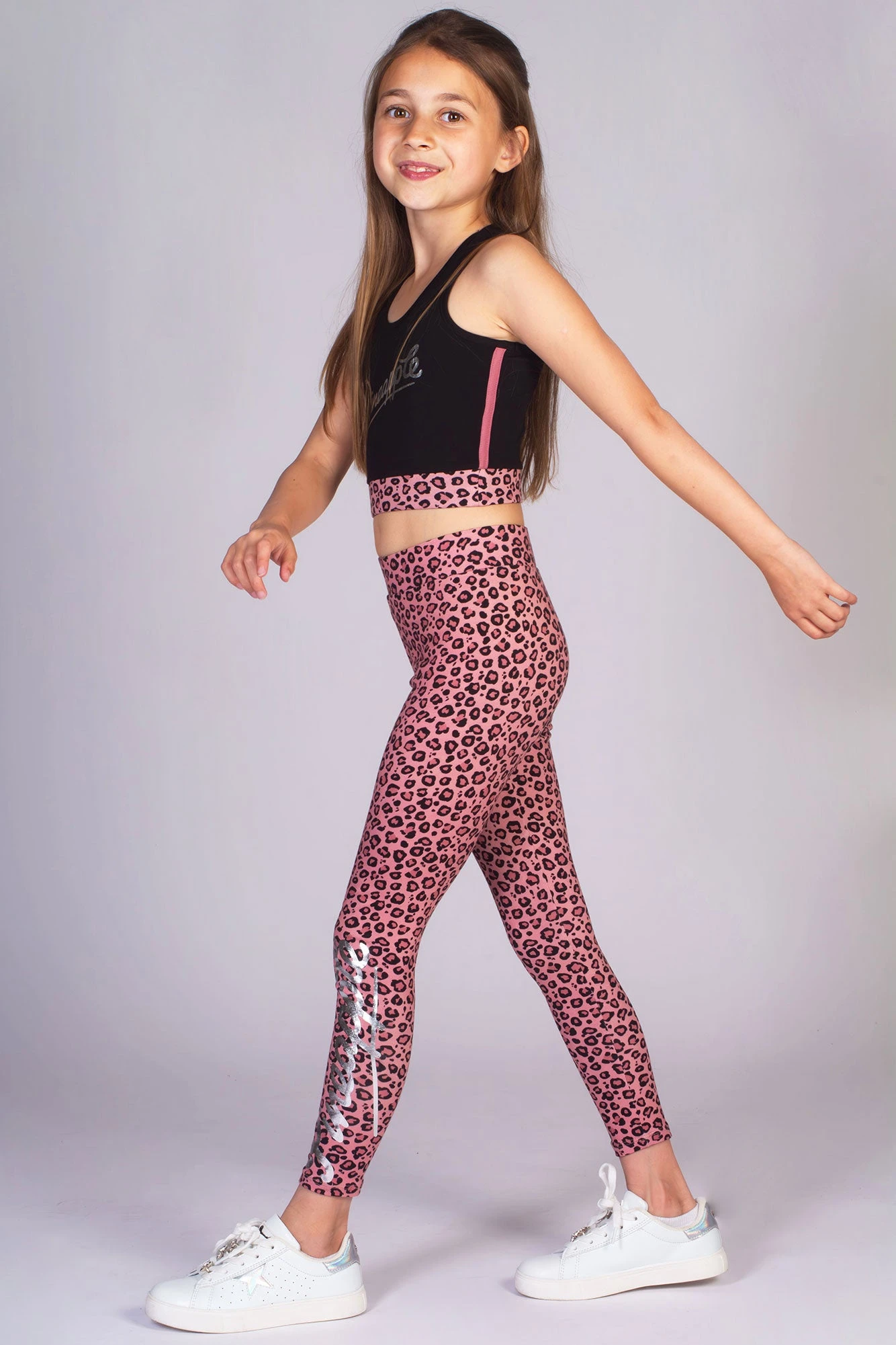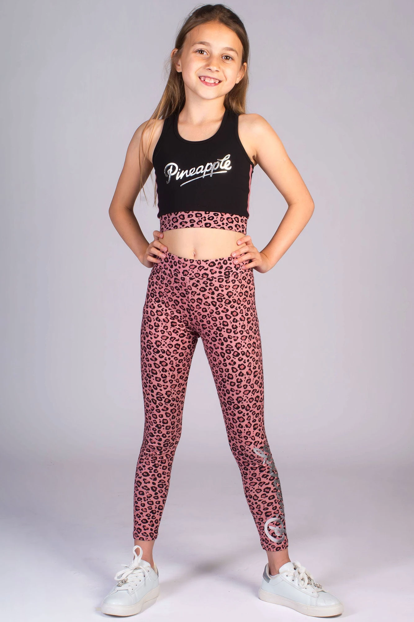 Whether it’s a dance class or a party, this midi length crop top for girls fits most occasions! Featuring a secure elasticated pink leopard print waistband and contrast colour side stripe, as well as a silver foil Pineapple logo print across the chest. Matching items such as leopard panel leggings are available to complete the look.