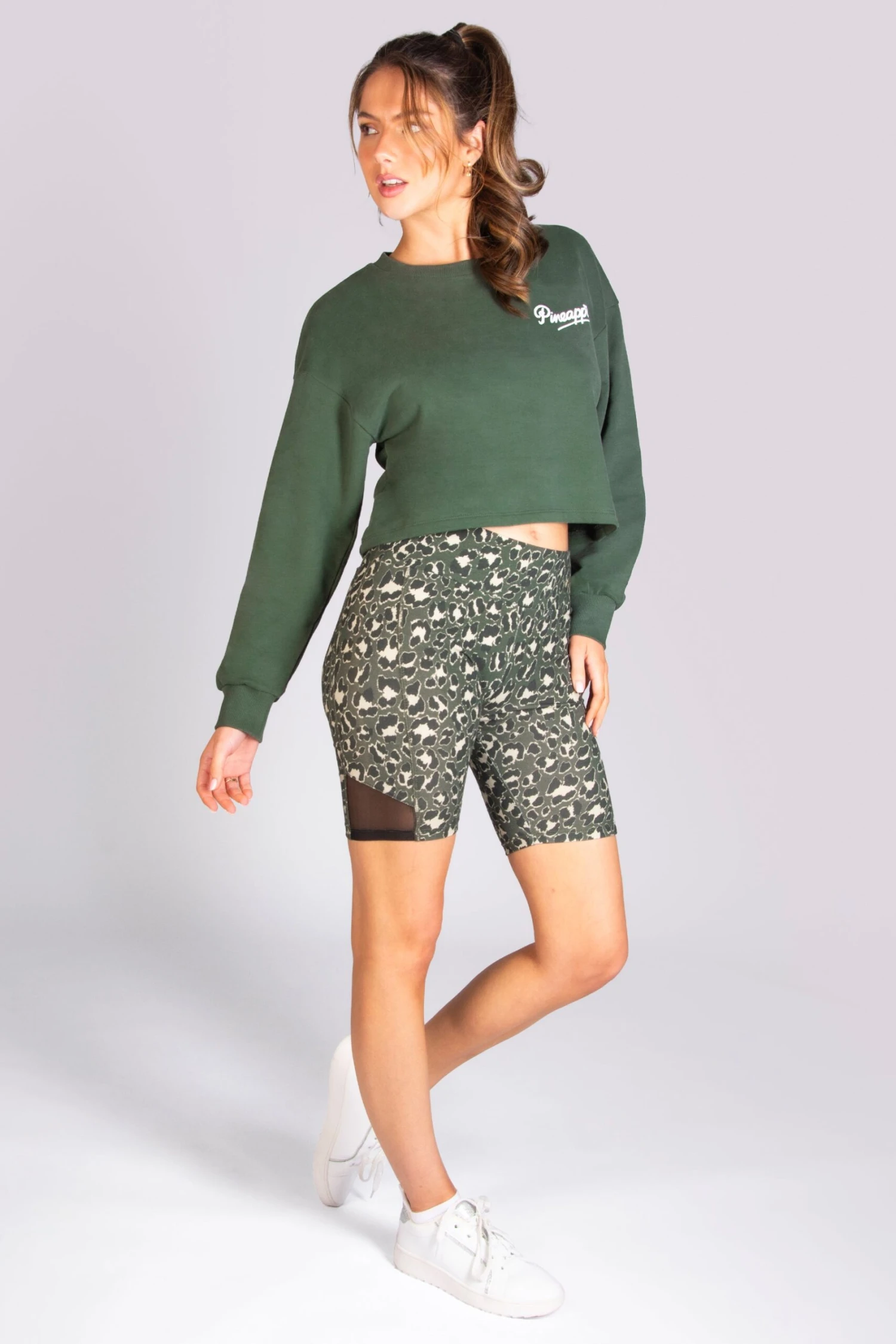 These khaki cycling shorts for women in all over leopard print are perfect for the gym or any dance class. With a delicate gold foil Pineapple logo on the hip, mesh panel on the sides and high waistband, these khaki shorts are flattering on anyone. Wear with our matching Khaki Styles.Â