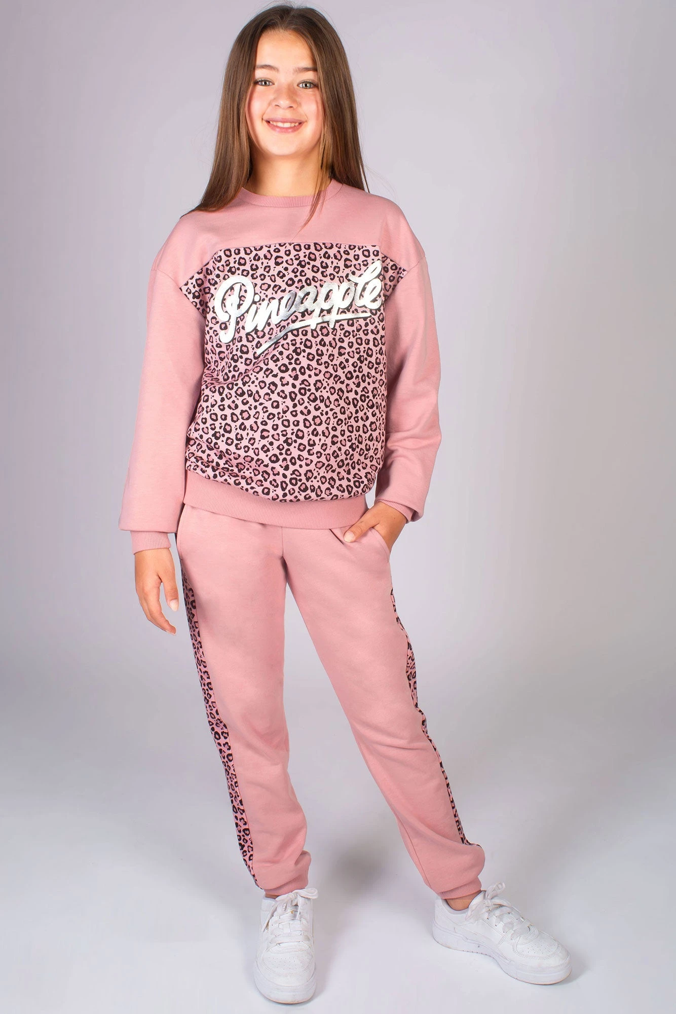 Refresh your wardrobe with this Pineapple leopard print pink crew neck sweater for girls, featuring a bold foil chest logo. In a dusky pink colourway, this girls’ sweat top is cut from our soft and cosy cotton rich blend for maximum comfort. Matching bottoms available for the full co-ord look.