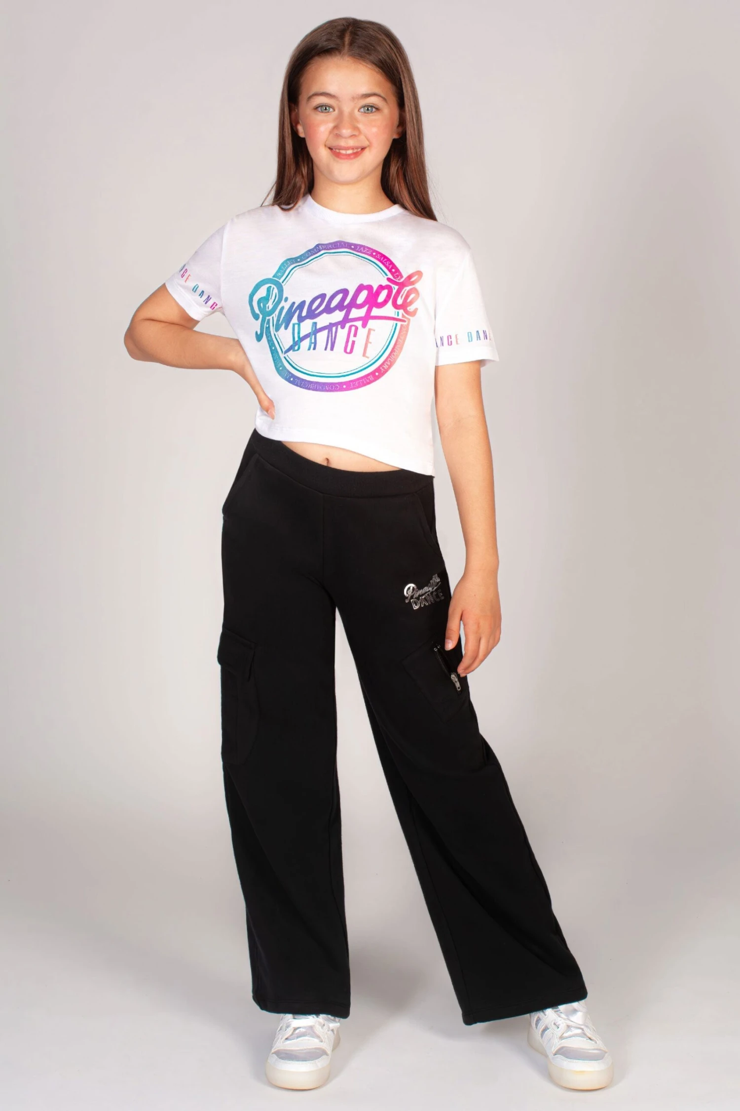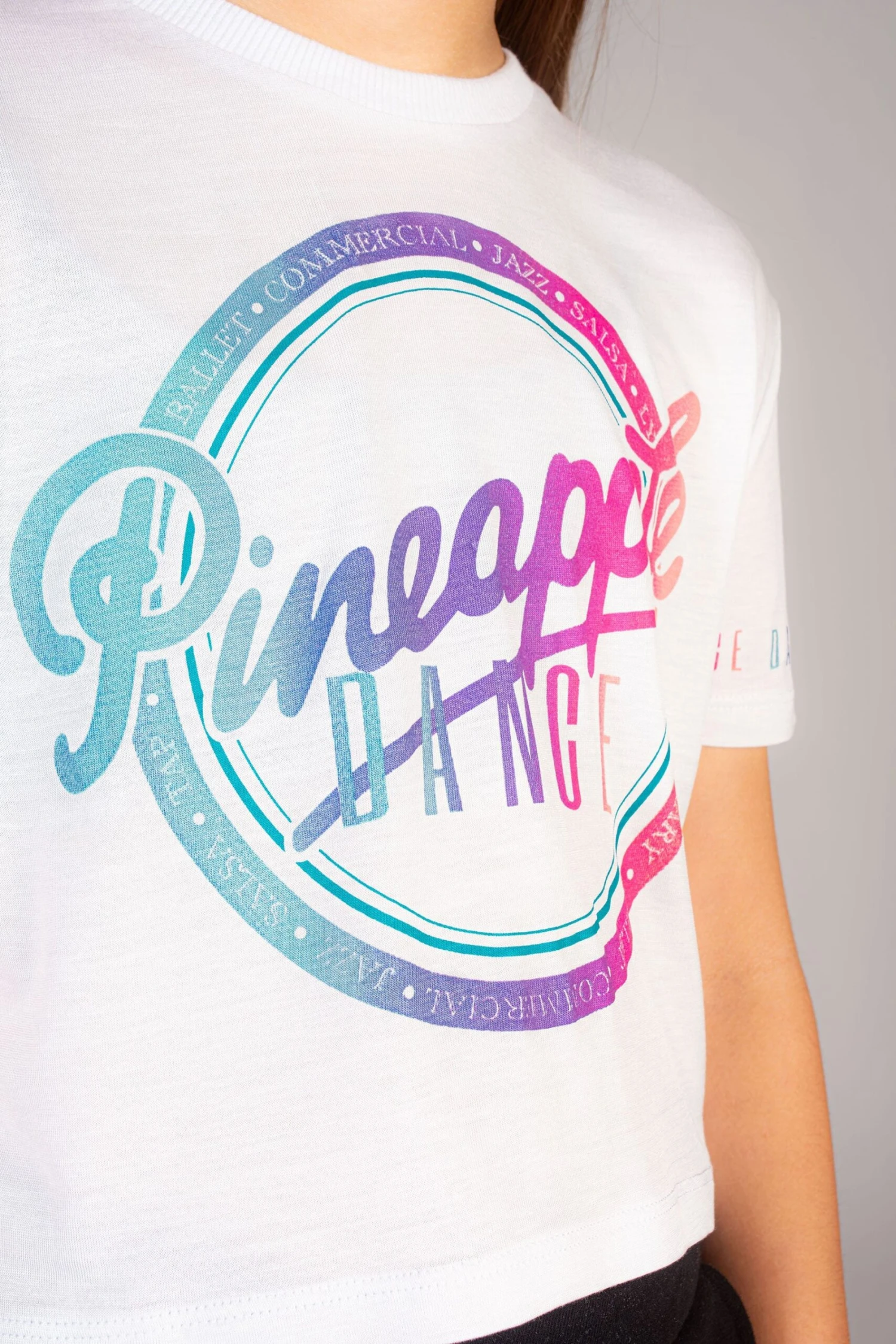 This boxy fit midi white crop t-shirt is the perfect top to brighten up anyone’s day! Versatile and easy to wear, this tee with rainbow print Pineapple dance matches back with all your Pineapple favourites!