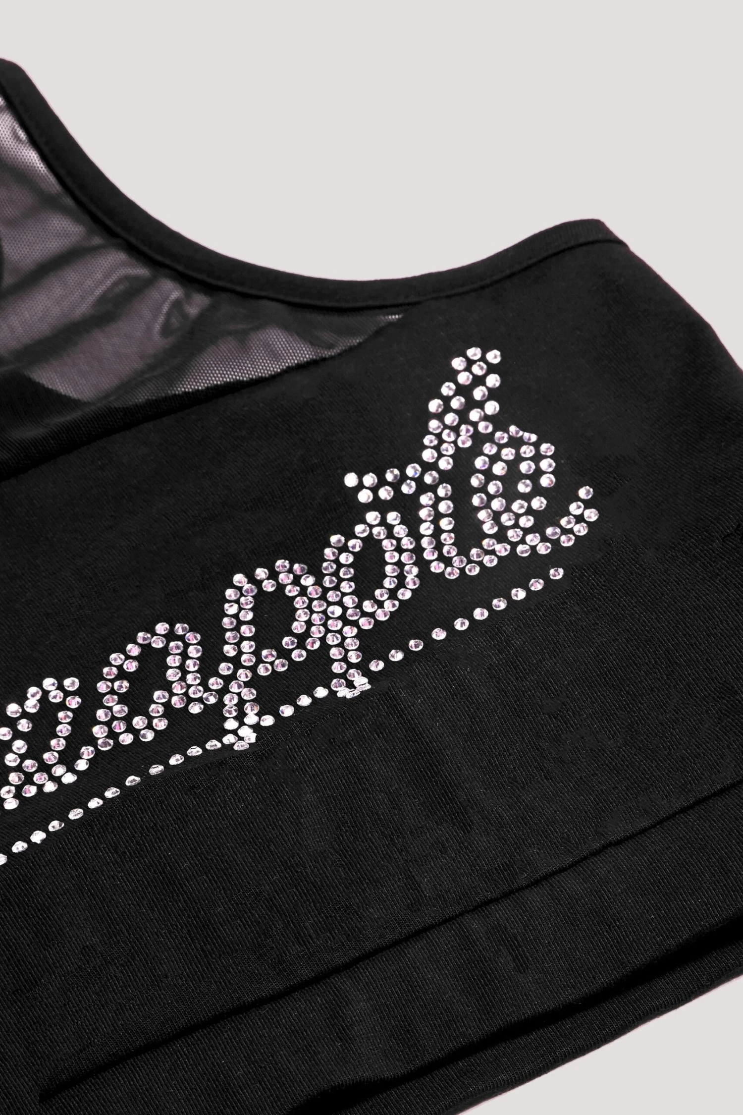 Refresh your wardrobe with this fitted black crop top for kids with mesh panels and chest logo in diamanté studs. Made in our soft and stretchy cotton blend featuring a mesh panel and finished with elasticated hem band for a secure and customised fit.