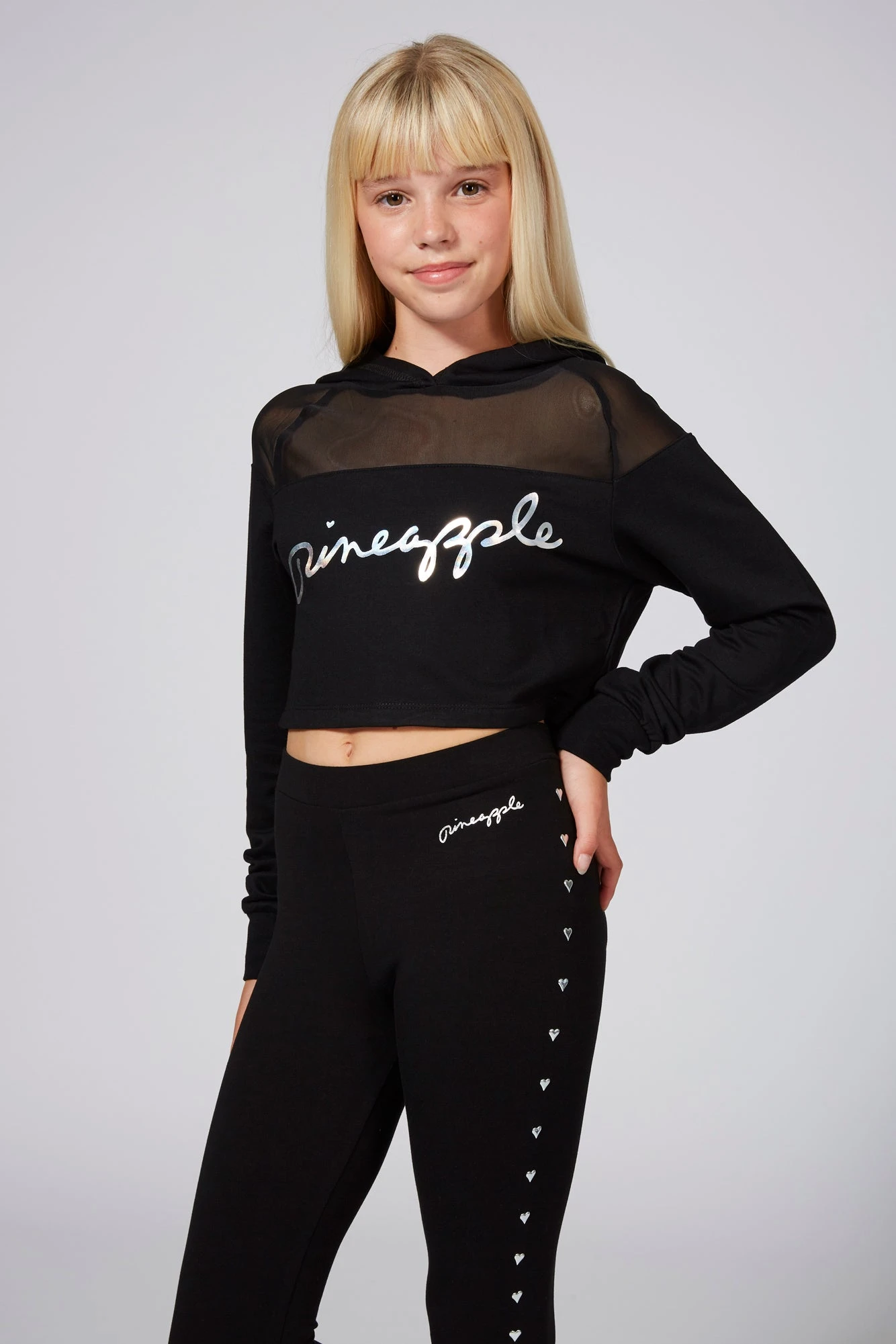 Get the party look in this Pineapple fleece hooded top for girls. We packed lots of style with power mesh shoulder panels front and back and a bold print logo. The cropped hem is stitched and curved front and dipped back.