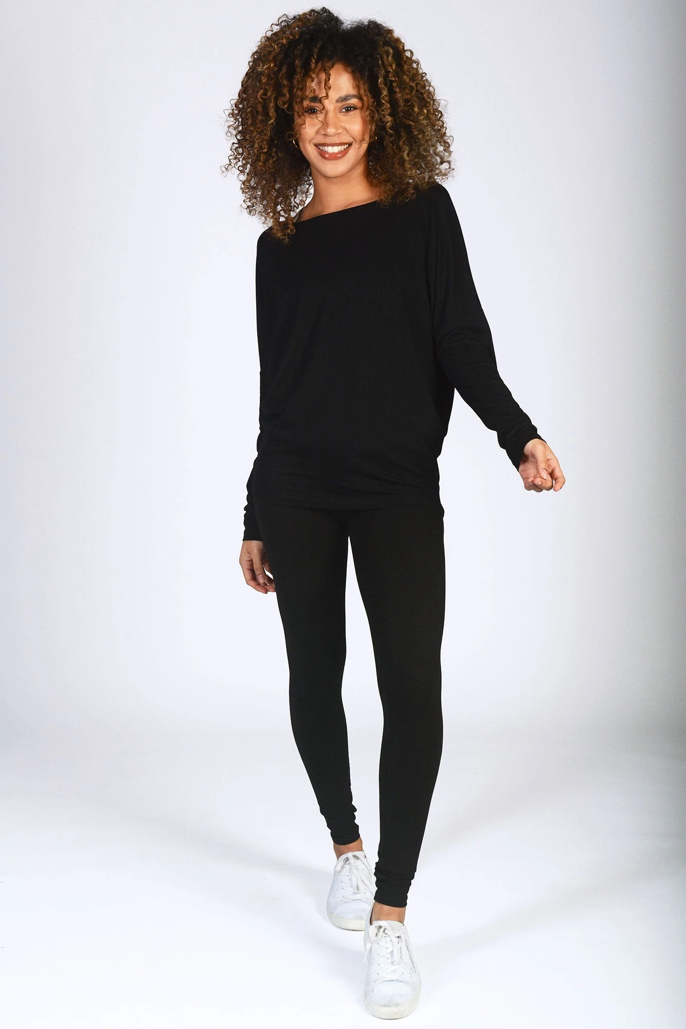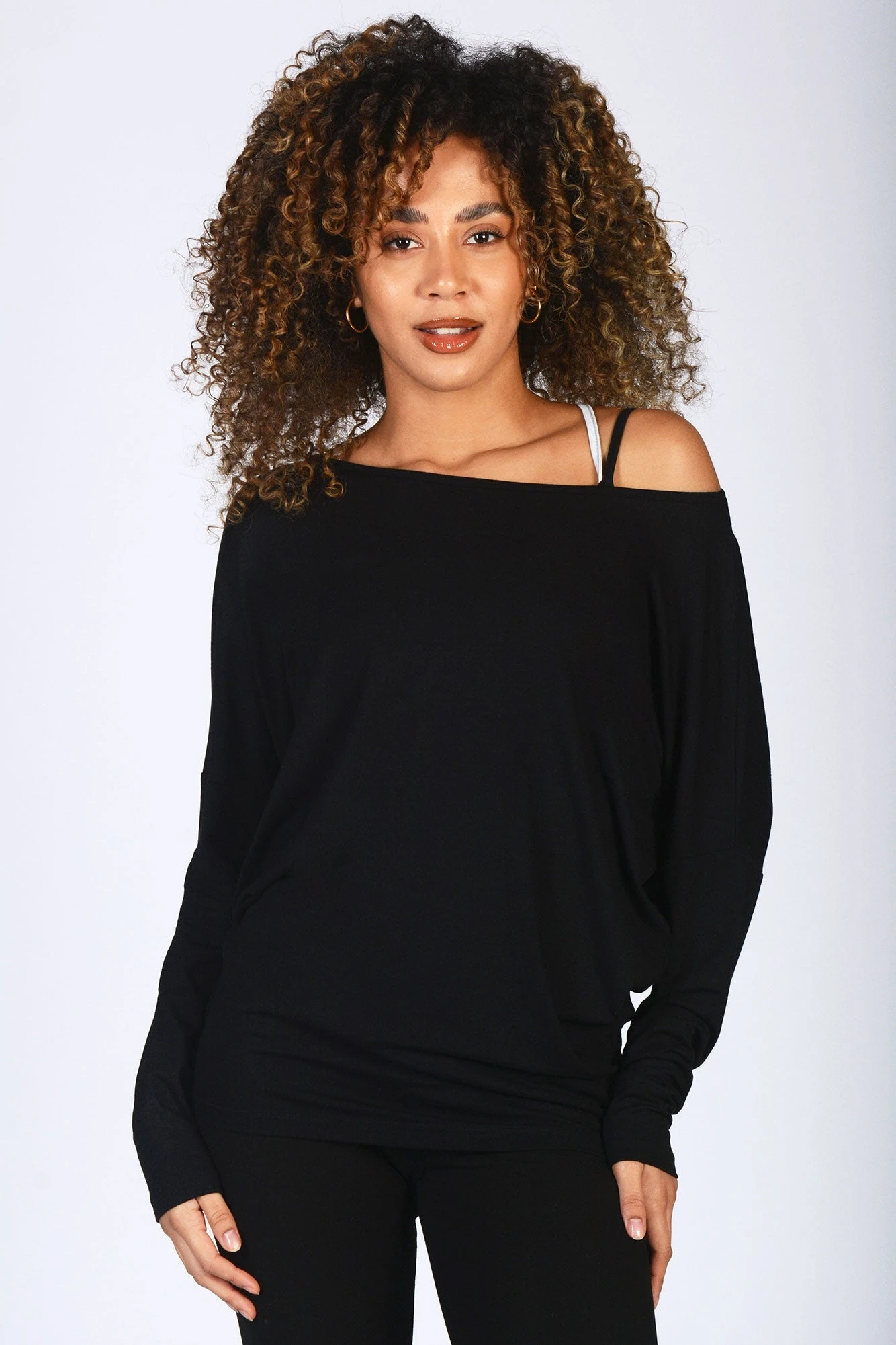 Long sleeve tunic style top made in our soft viscose blend and fit for all occasions. Featuring small logo on sleeve, subtle batwing sleeves and subtle dipped hem. A comfortable long sleeve top that can be worn on a night out or to a dance class.