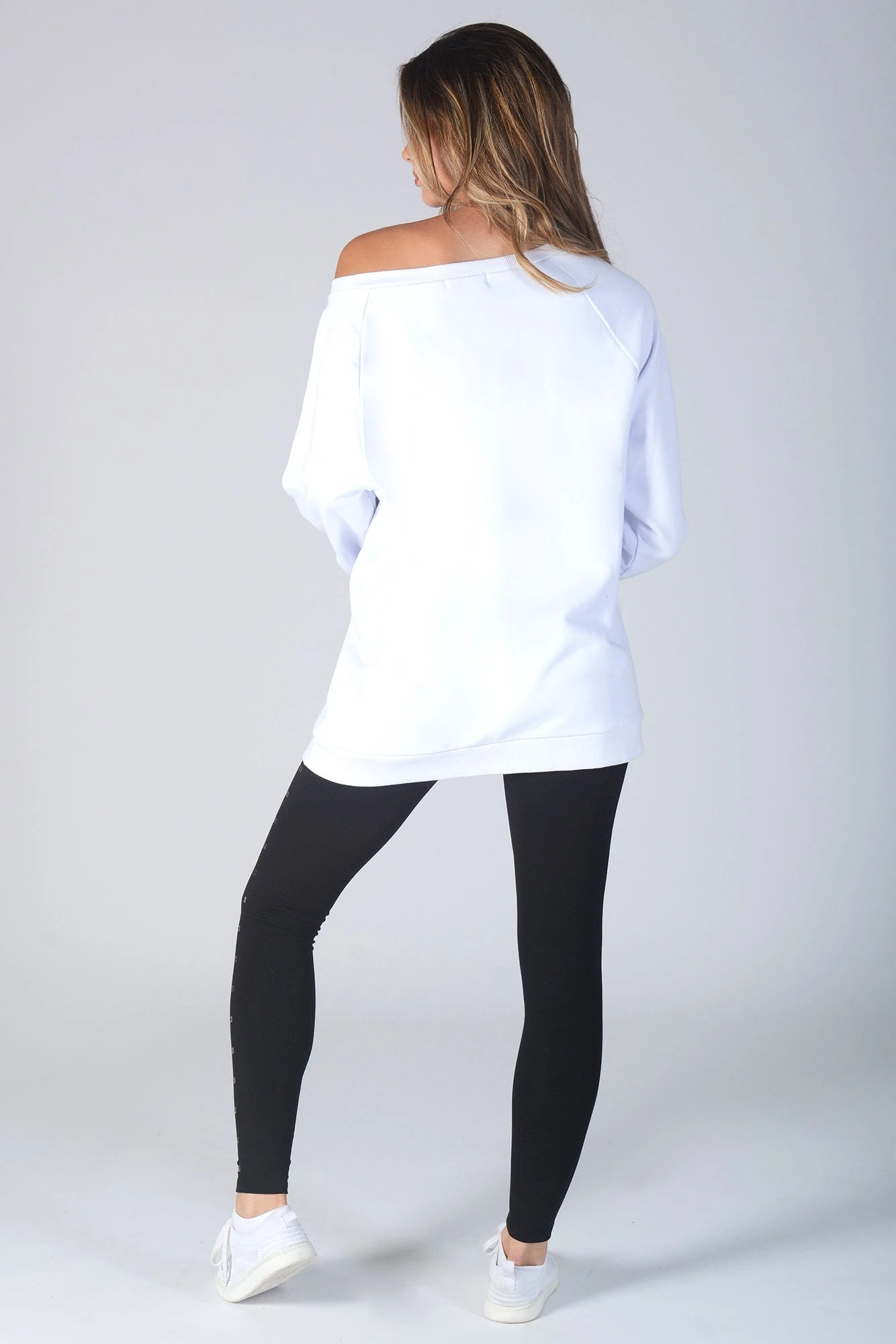 Pineapple women’s oversized sweatshirt with gold glitter print logo. This eyecatching wide neck top has raglan seams and forward placed side seams giving it structure and comfort, with functional concealed side pockets.