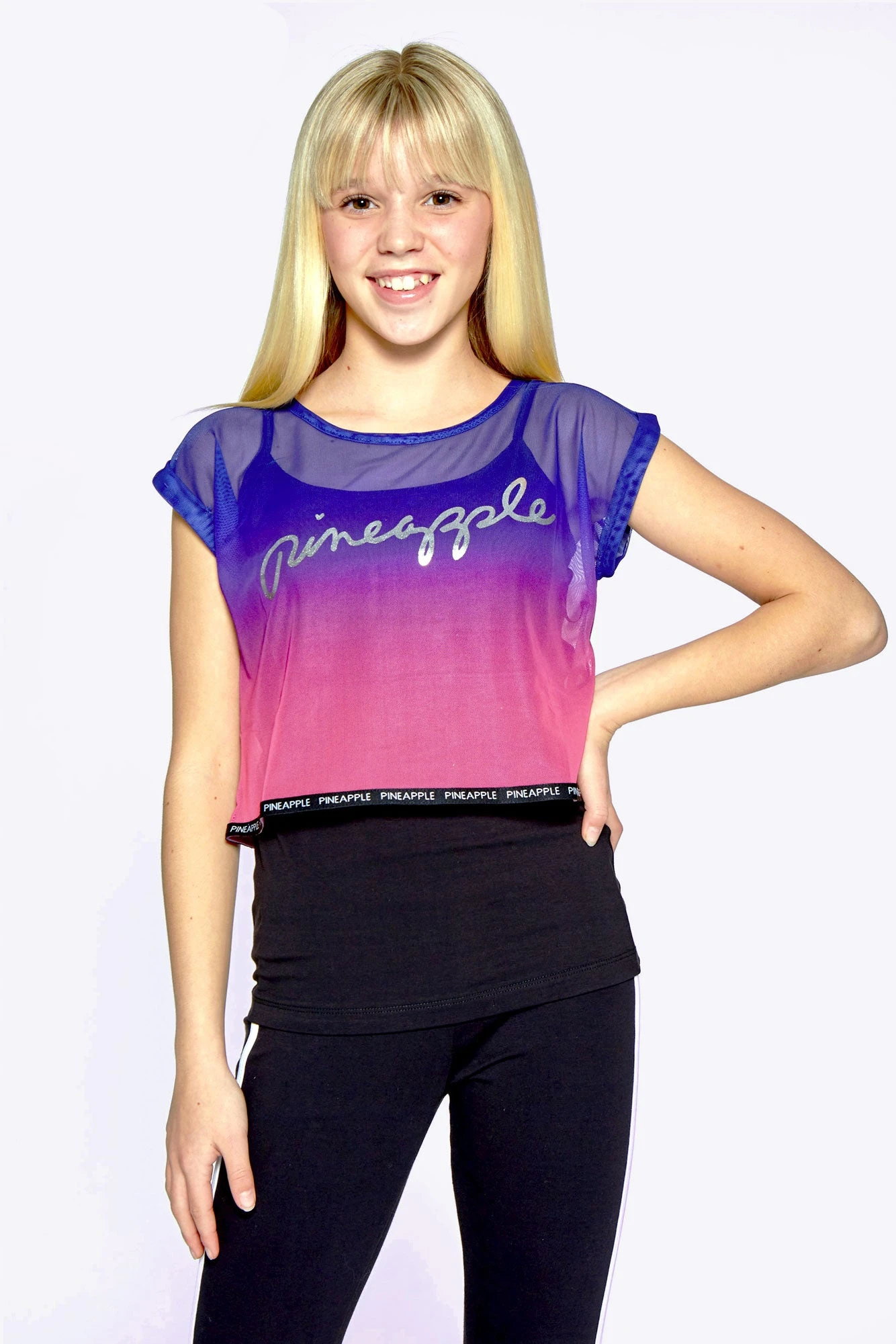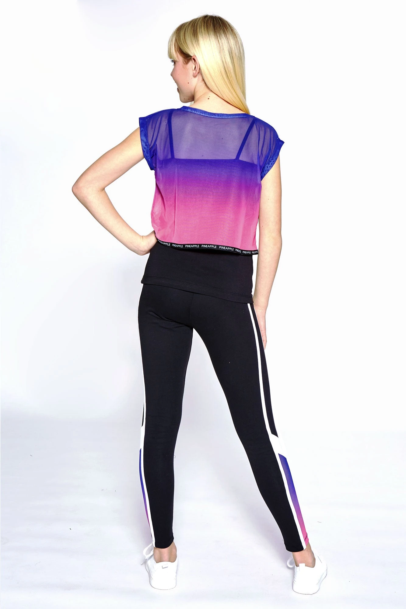 Layer up in our crop t-shirt and strappy vest double layer top set featuring a crop t-shirt in a super colourful cool ombré mesh and a classic essential stretch strappy vest which you can mix and match with the rest of your wardrobe.