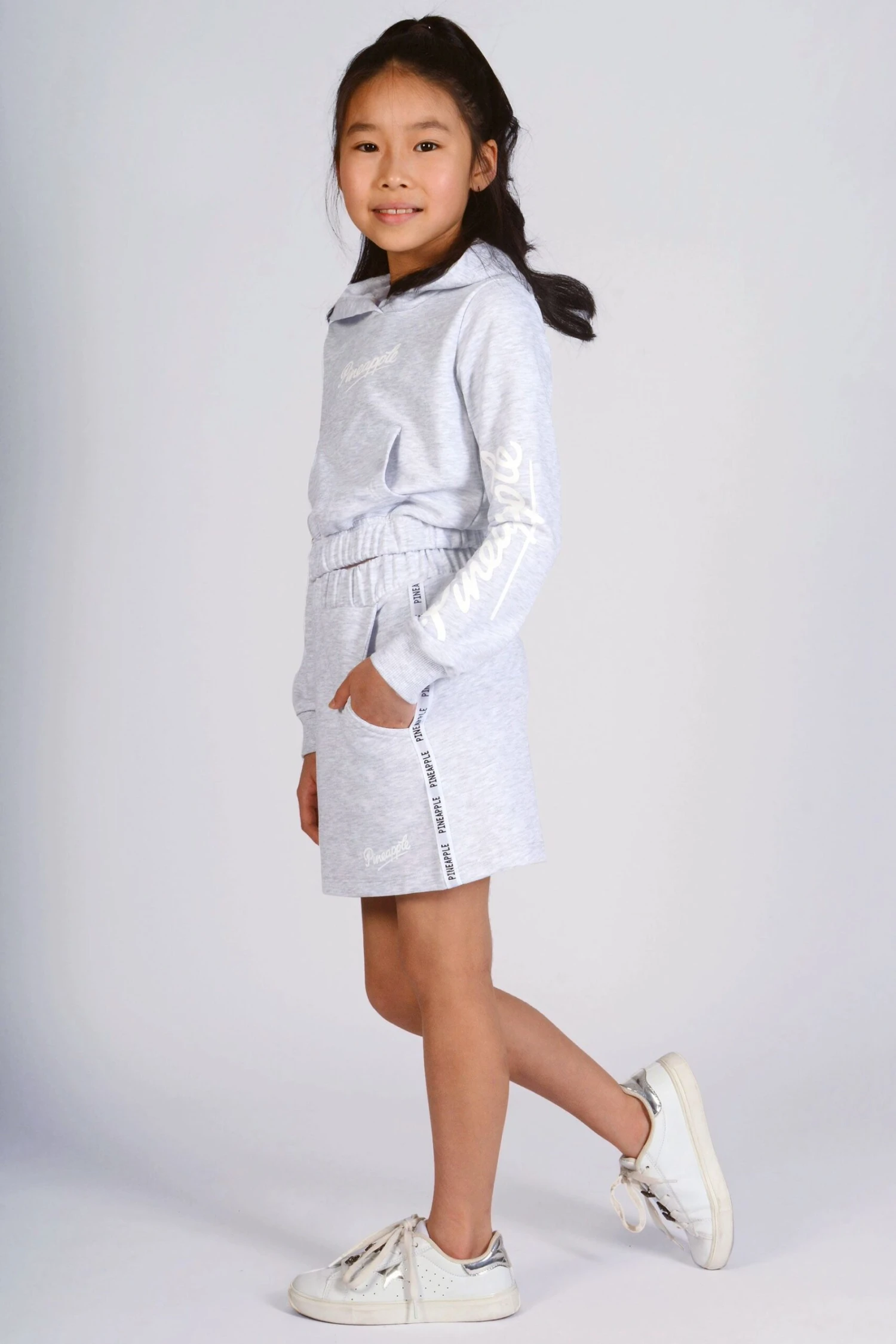 Super cosy and soft crop hoodie featuring elasticated hem for a more customised and sporty fit. Team with the matching sporty skirt for the ultimate weekend look. Featuring a front kangaroo pocket and printed logo on the sleeve and chest.