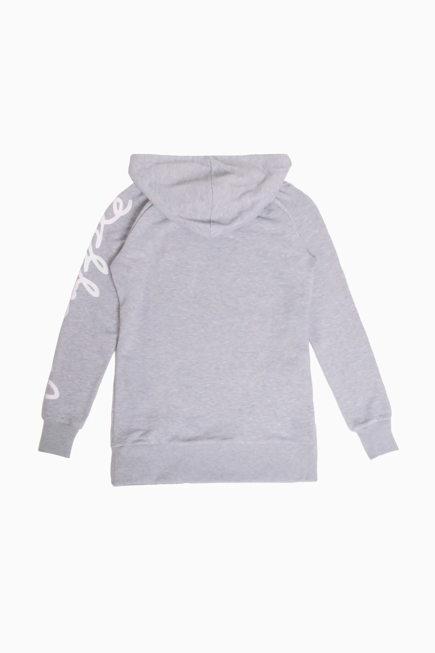 Cosy fleece drawcord hoodie with extra long line, side pockets, ribbed cuffs and hem, and classic foil logo detail.