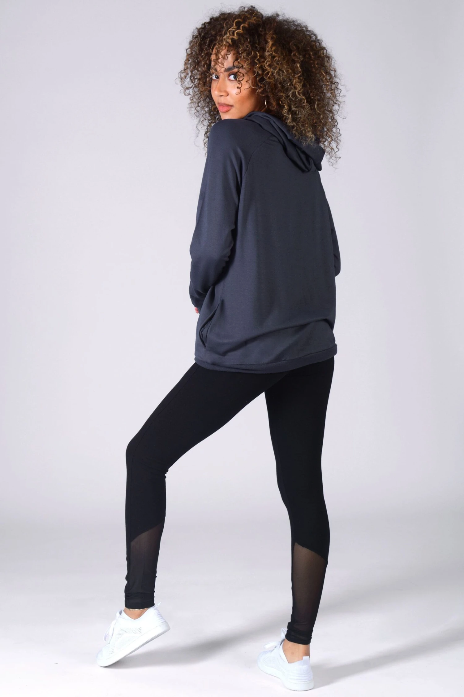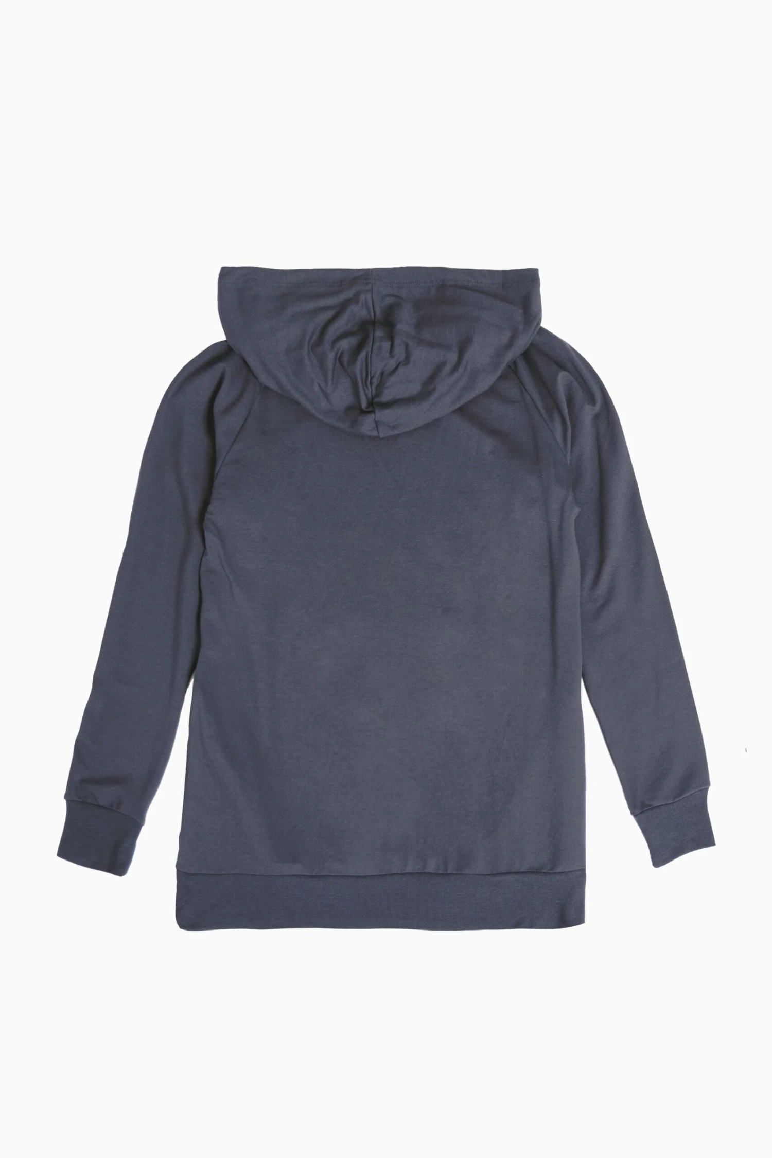 A cosy, oversized drawcord hoodie in longline, side pockets, ribbed cuffs and hem, and chest logo print in foil.