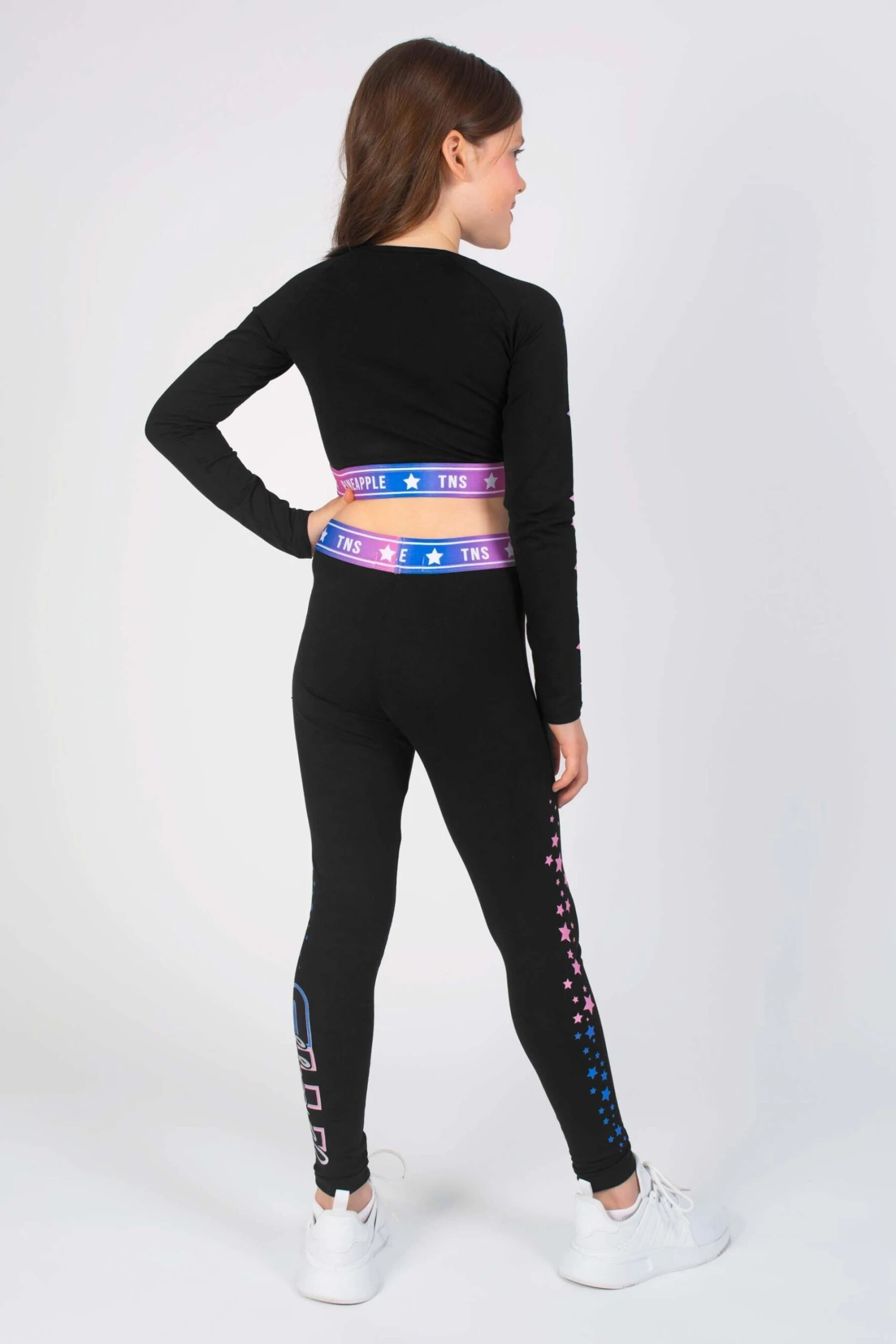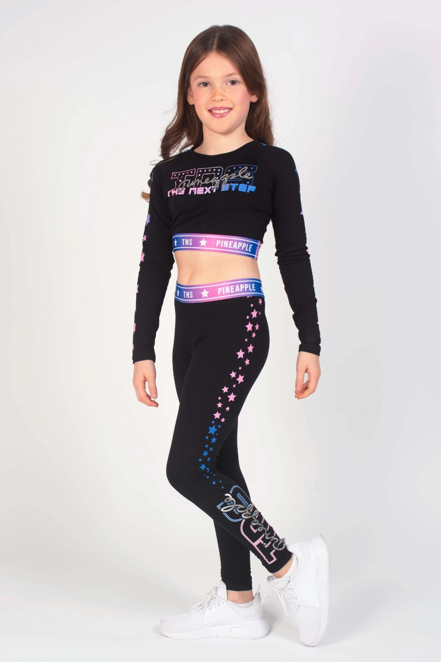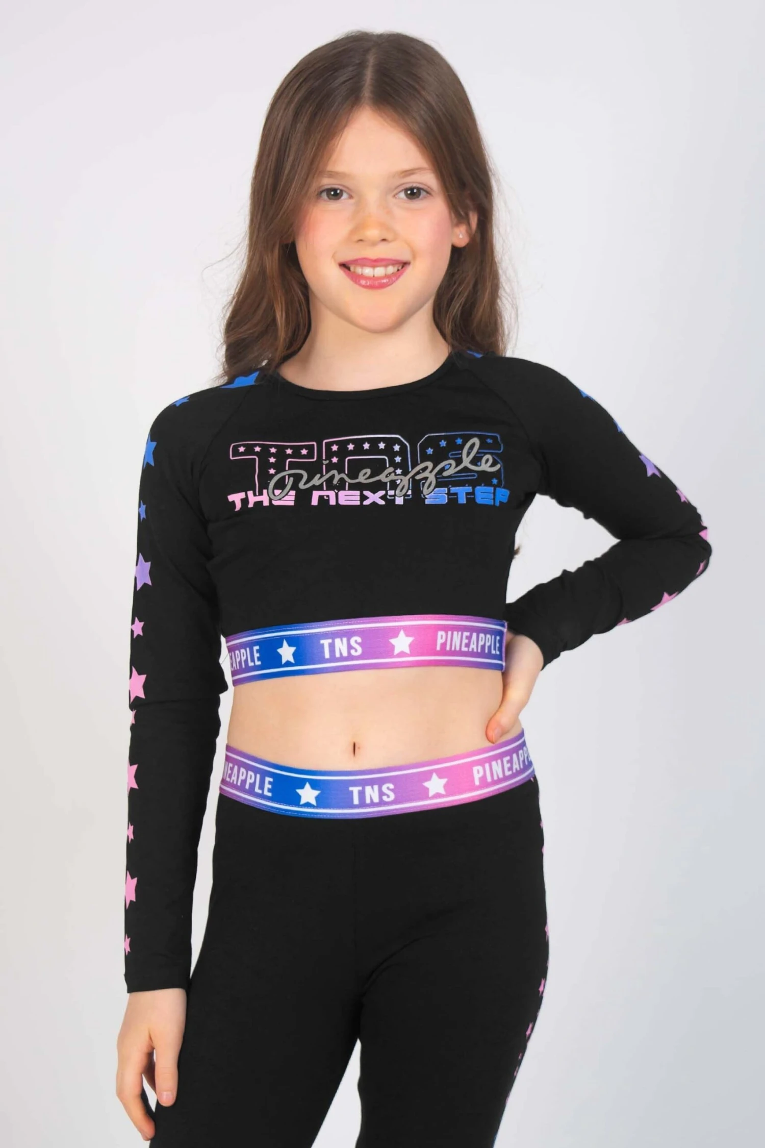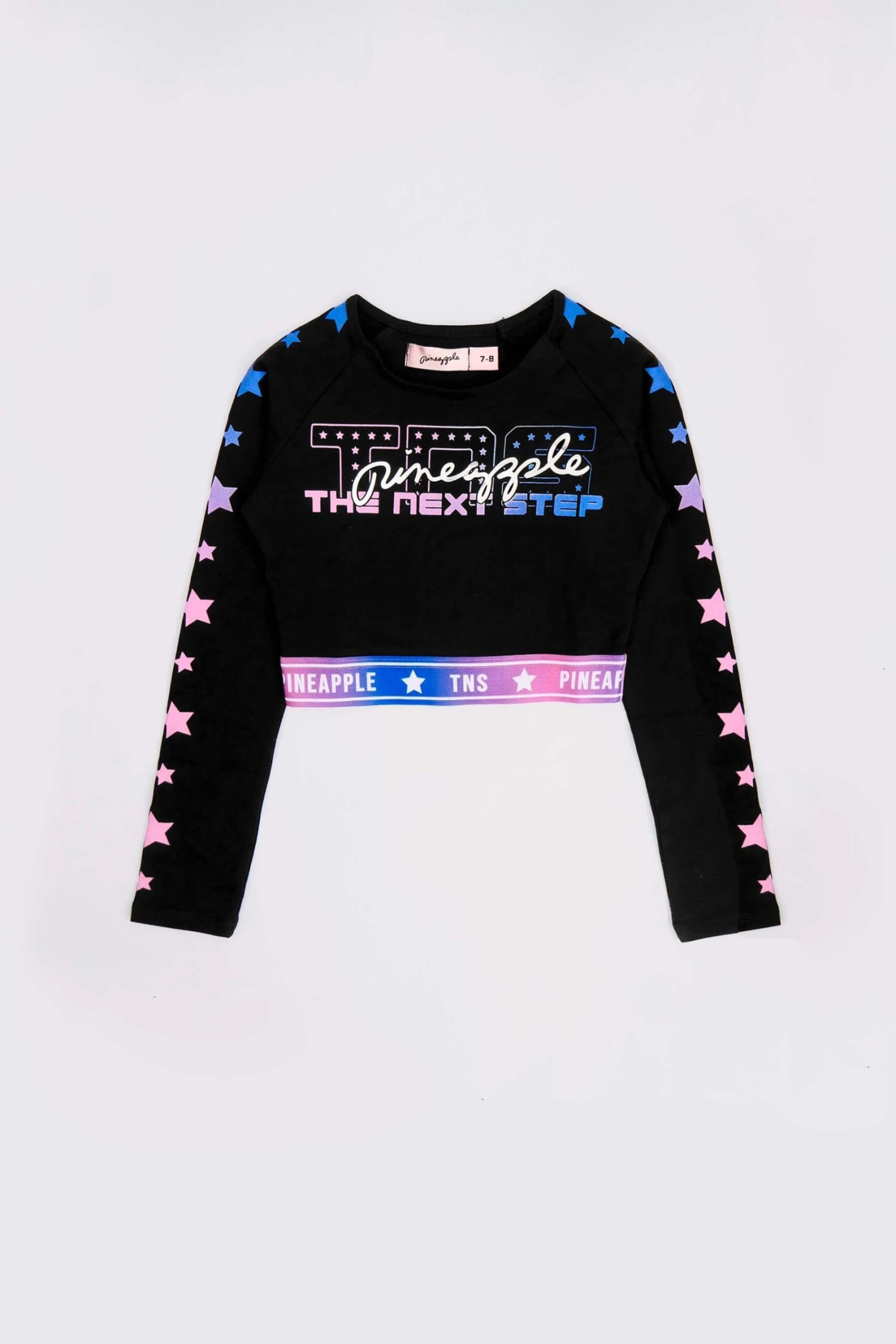 Be ready to dance like an A-Troupe in our long sleeve crop top which features a soft ombre tape hem, a bold chest logo and star print running along sleeves.