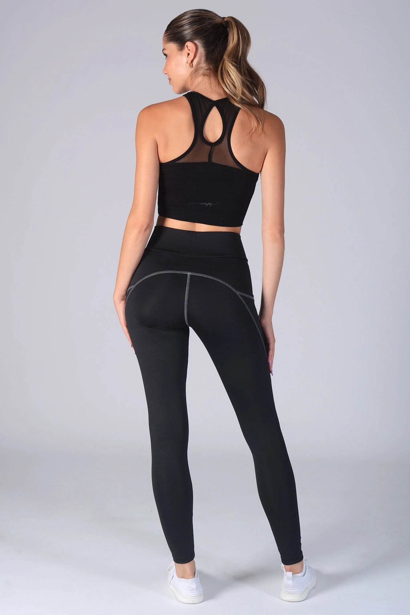 The black full-length leggings for women have a performance style design with contrast coverstitch detail at the seams. We added a practical pocket for small accessories with a small print logo and curved back seam to finish the look.