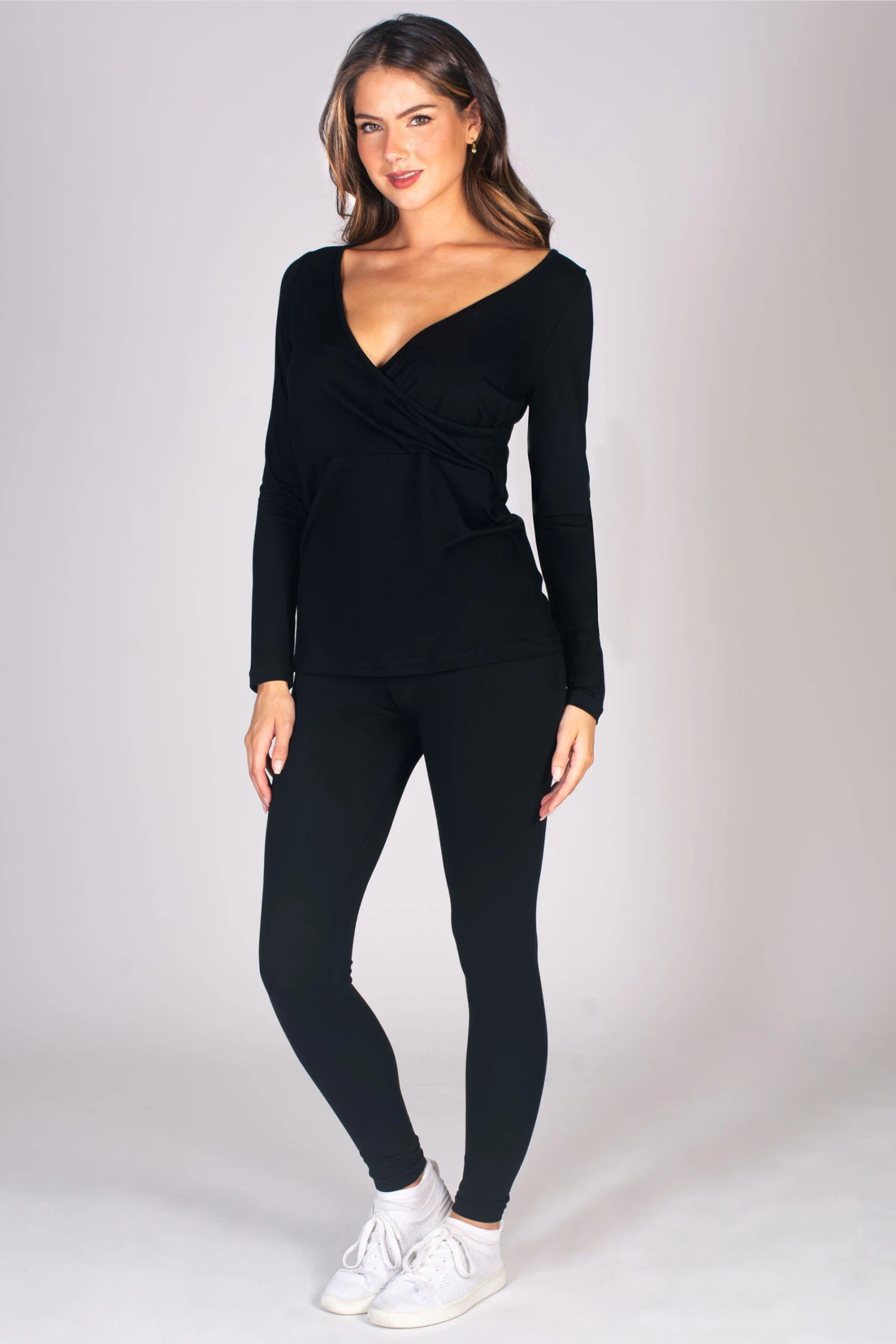 Elevate your wardrobe with this chic black jersey long sleeve wrap top. With its reversible fit, you can take your look from day to night with just one piece. Complete with a wrap neckline that’s flattering worn both ways and a small hip logo. Pair it back with Pineapple Midi Skirt or Monroe Mesh Panel Leggings.Â