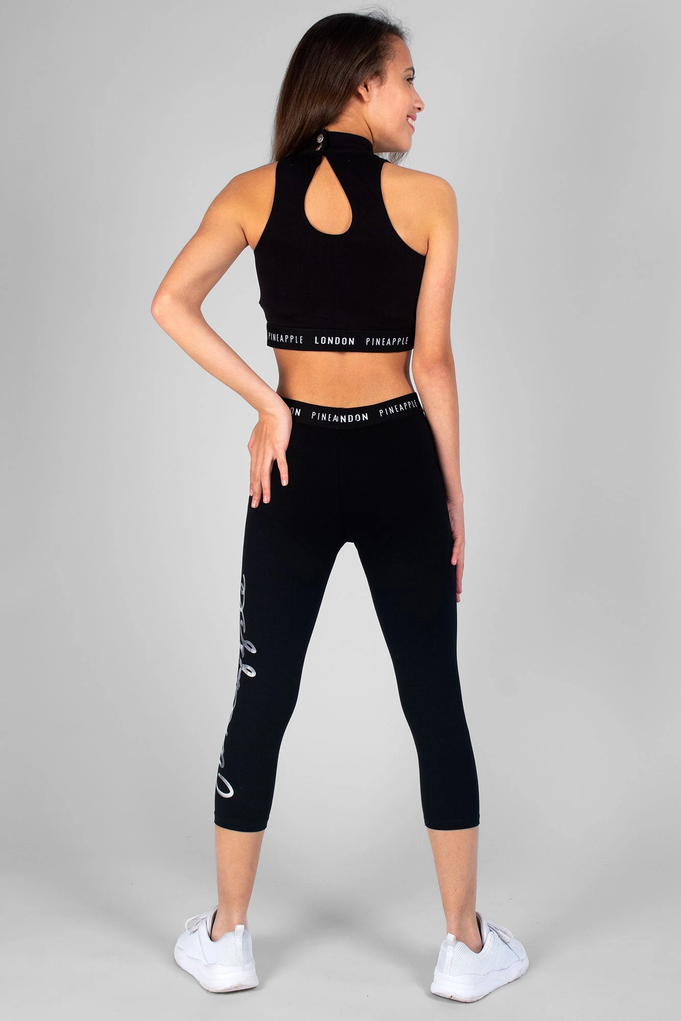 One for fashion fans, the Pineapple cropped black leggings for girls is back with a ‘PINEAPPLE’ branded tape waist band and silver foil print logo on the leg.