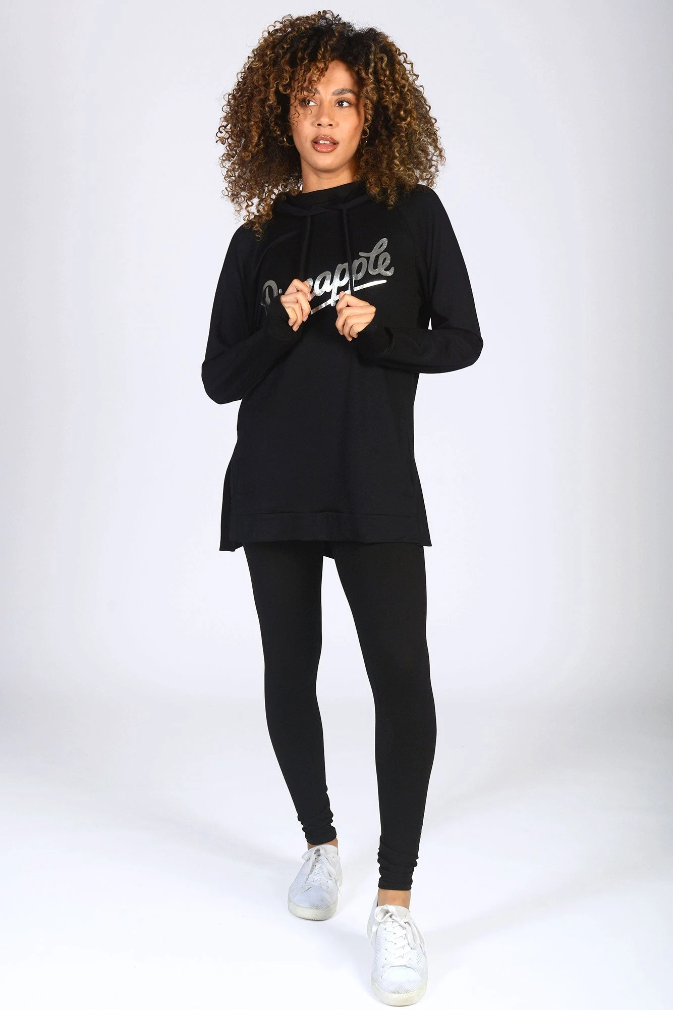 Super soft drawcord pullover longline hoodie in black featuring silver foil chest print and side split detail with pockets.