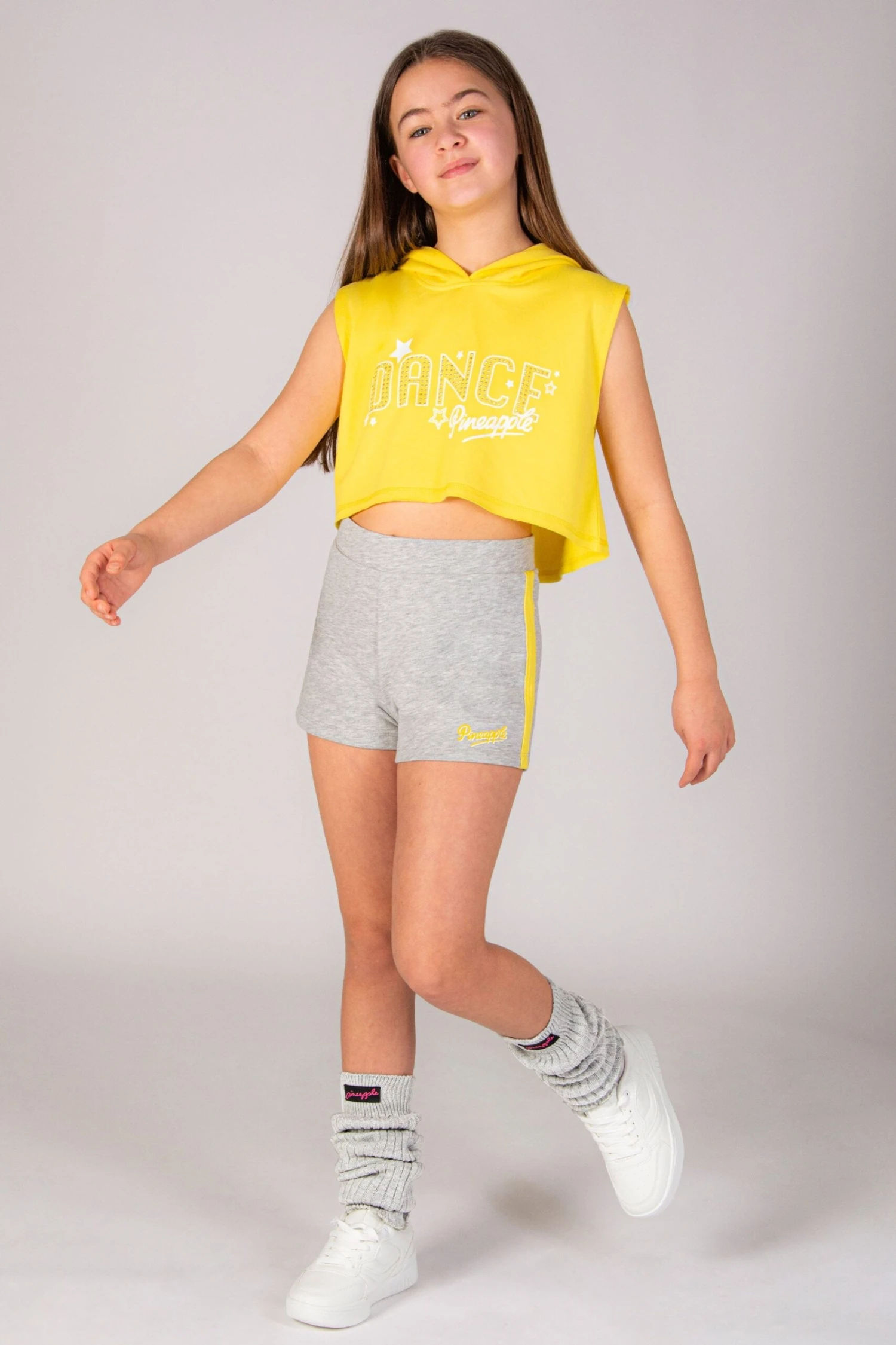 Look and feel like the dancing star in this sleeveless crop hoodie featuring gold studs and foil chest logo. In a boxy crop fit and with a raw hem finish. Pair back with your favourite leggings or joggers for the ultimate dancer look!