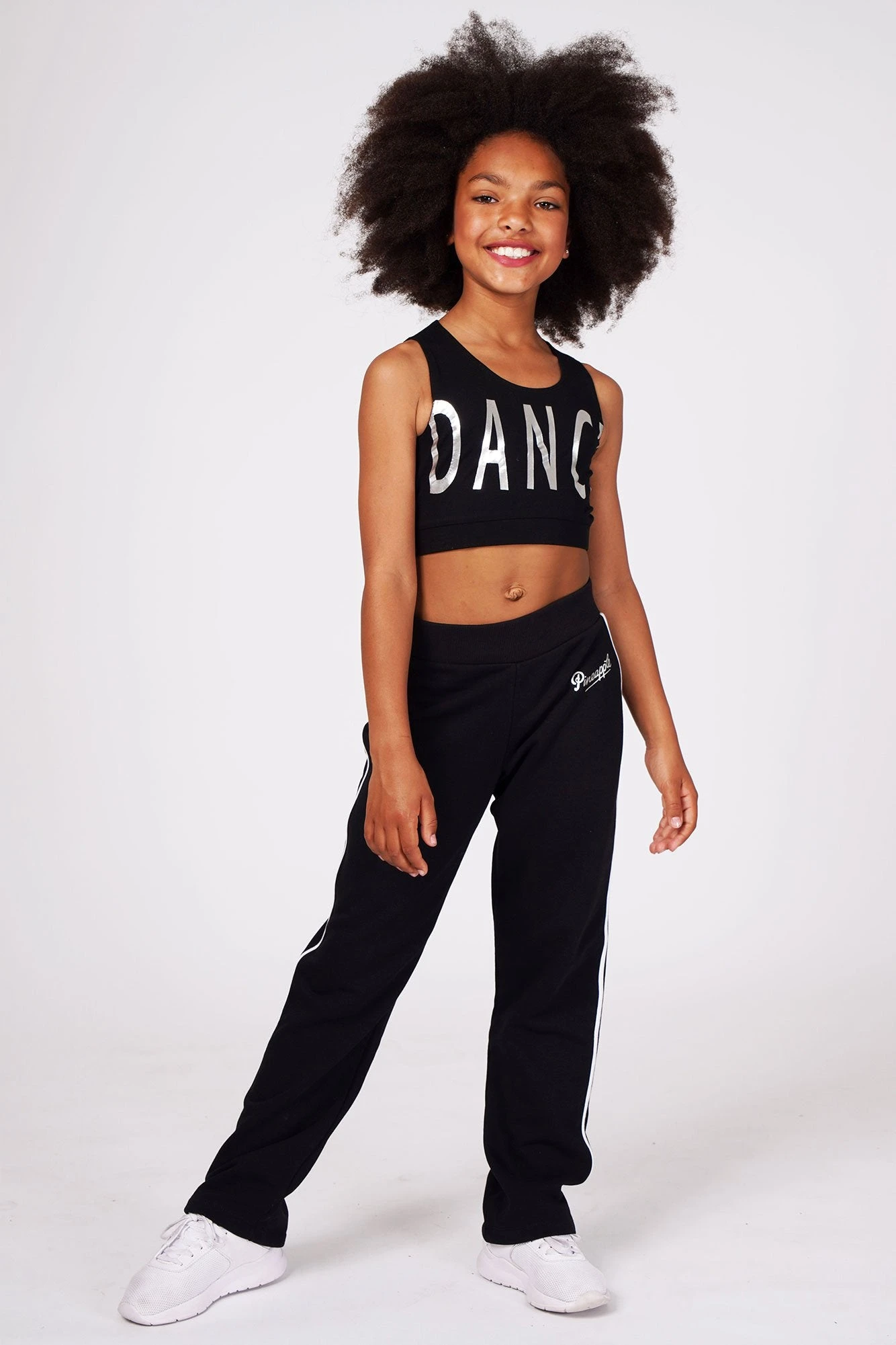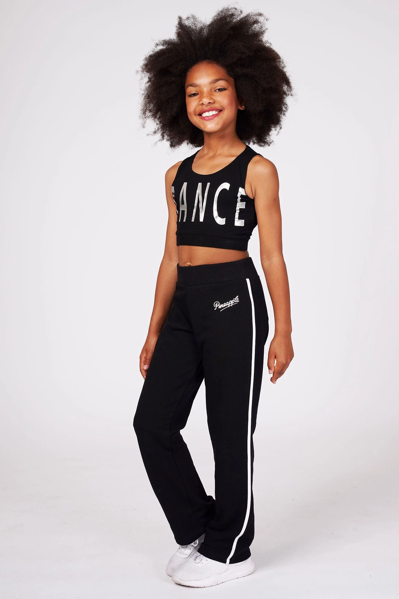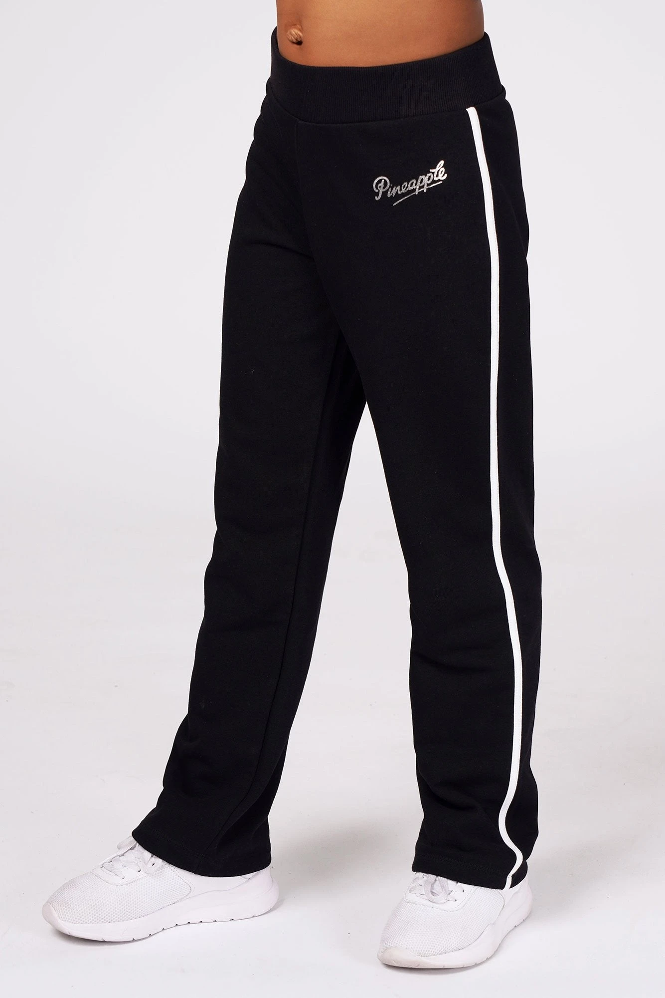 The Pineapple black straight joggers with contrast stripes for girls who like to lounge in style. The stripes run down the wide leg fit trousers with a foil print logo detail and comfortable elasticated rib waistband.