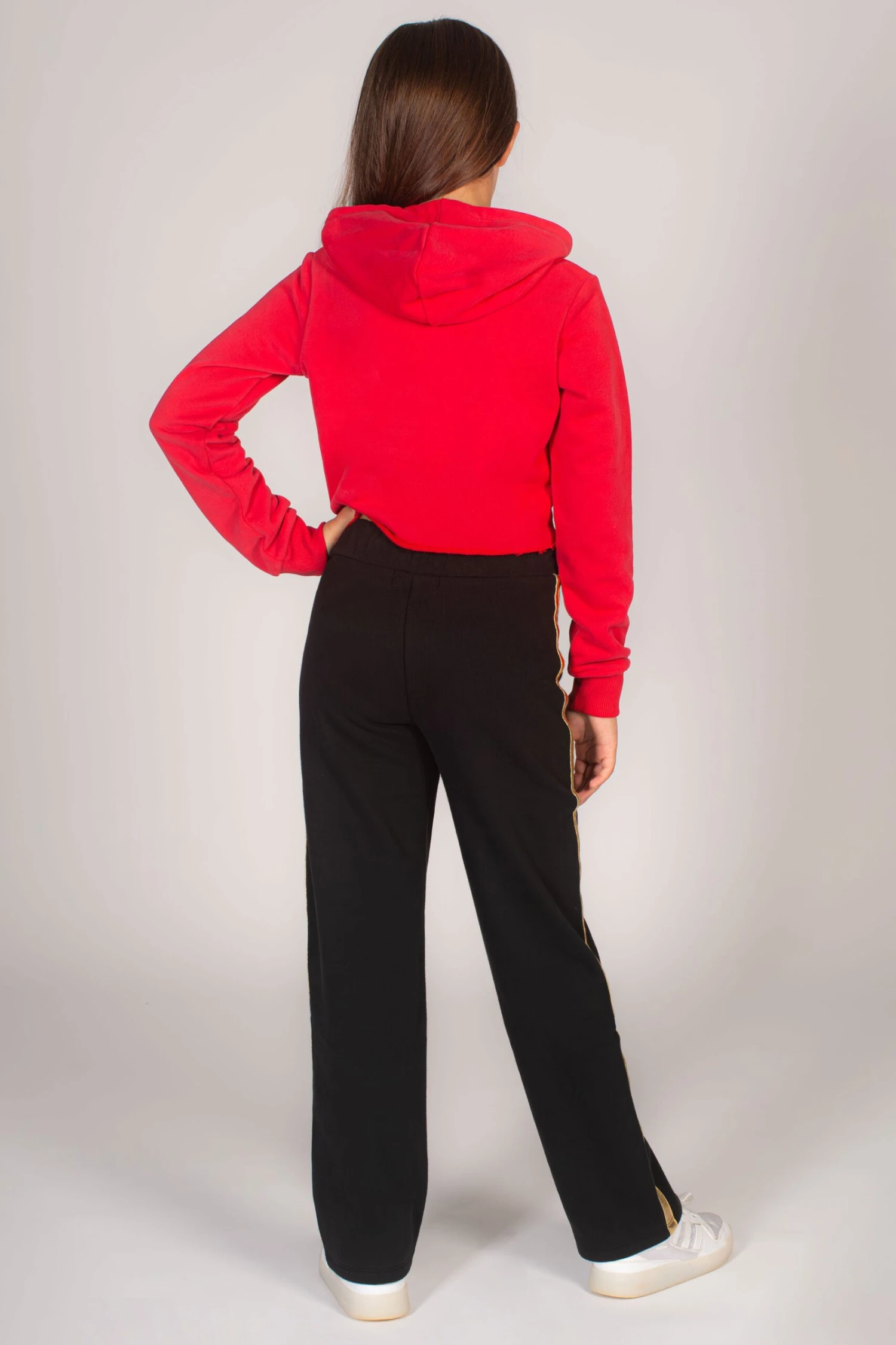 Model is wearing size 9-10 with matching Glitter Logo Crop Hoodie.