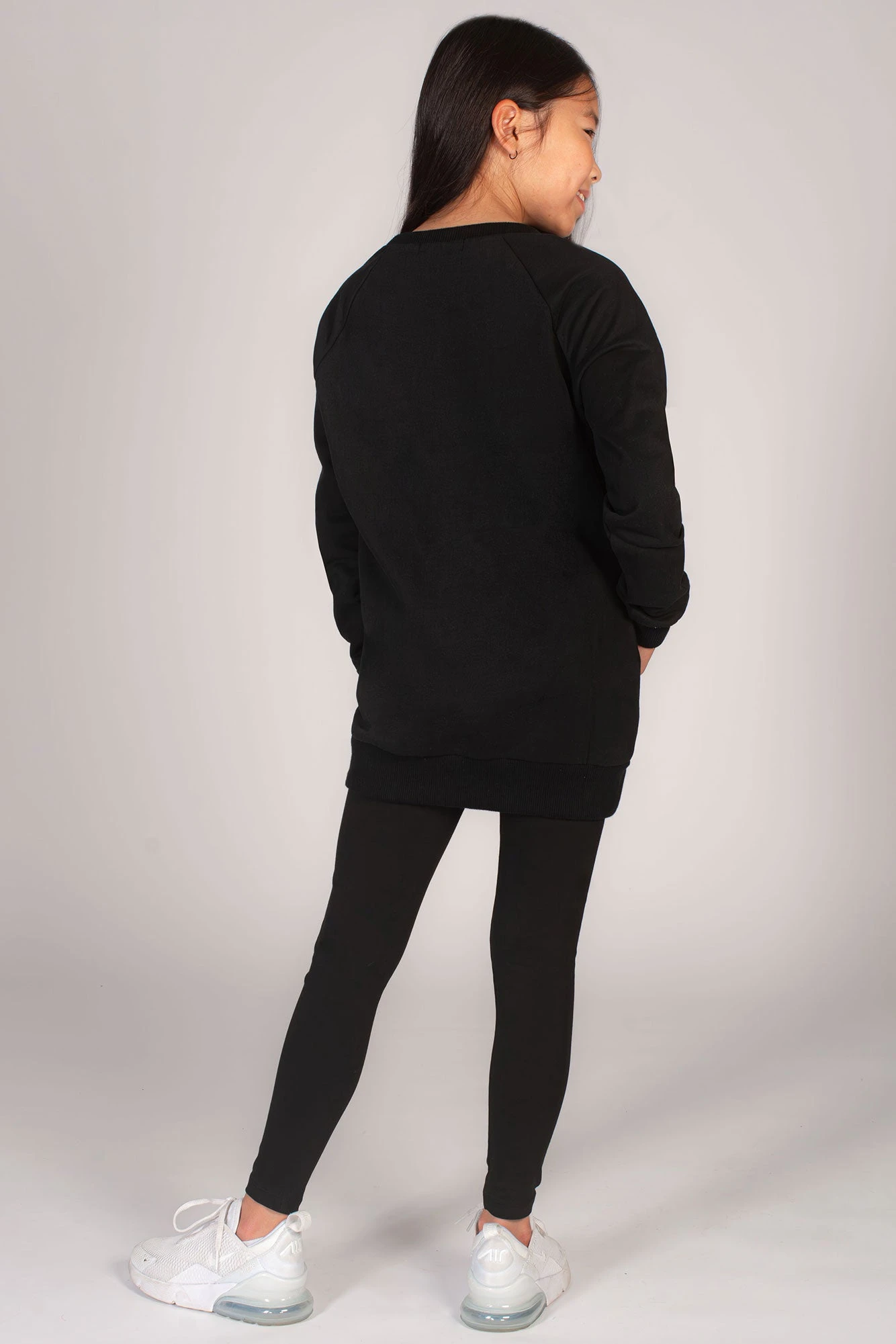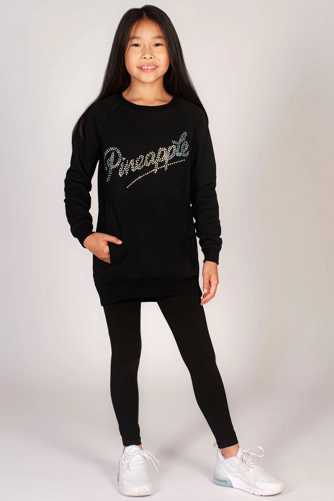 Perfect for casual days, this black longline sweater for girls features a soft fabric finish for all-day comfort. This girls’ top features a crew neck collar, slightly dropped shoulders and a Pineapple stud logo across the chest. Pair with our basic bottoms including our cycling shorts and dance leggings for a cool co-ord look.