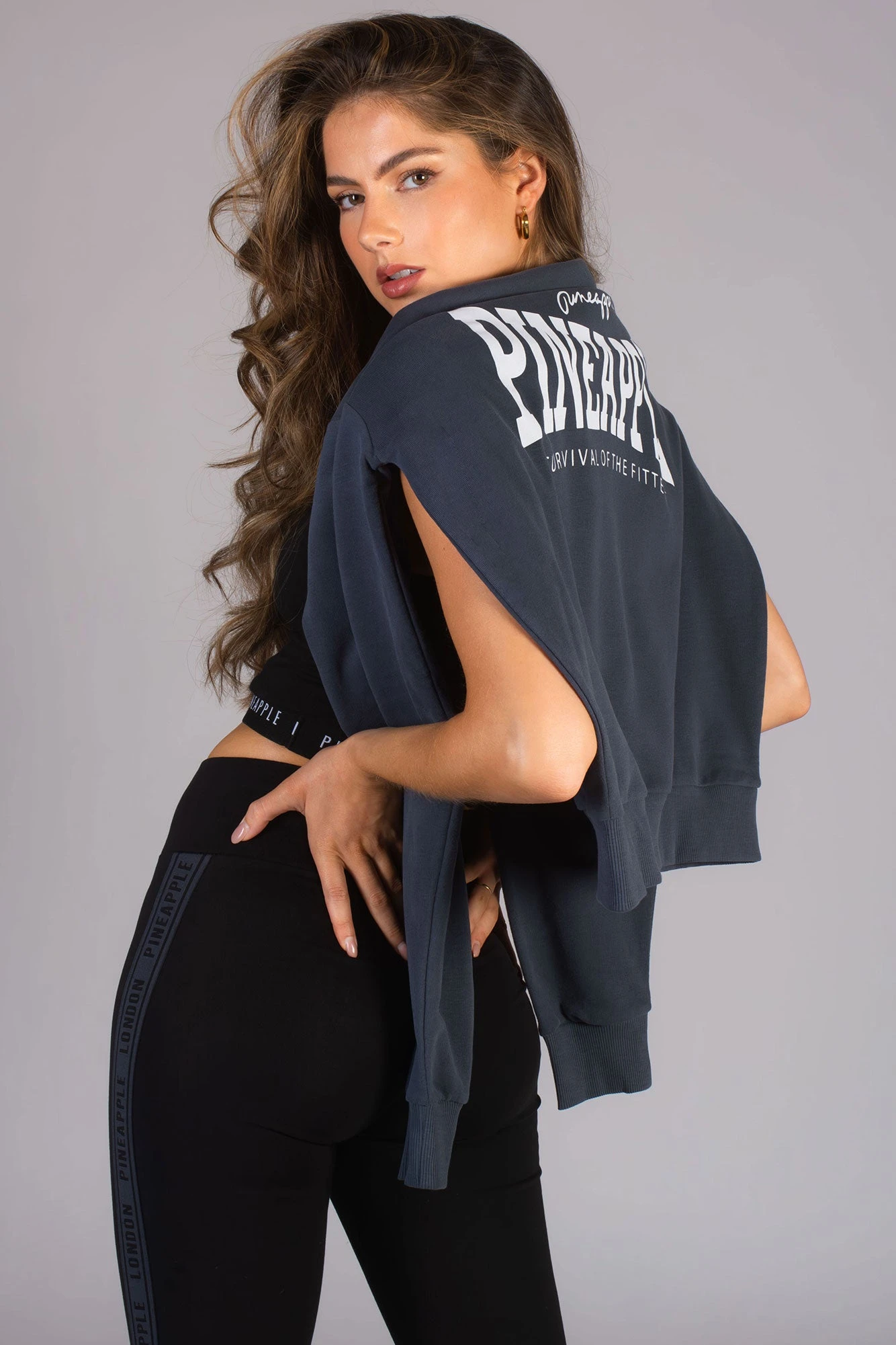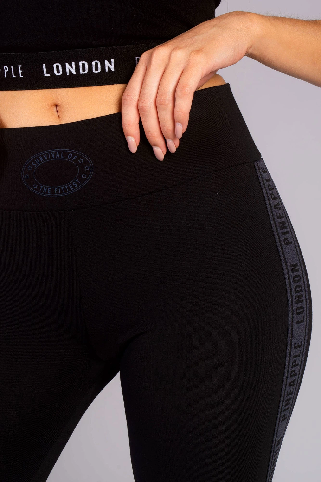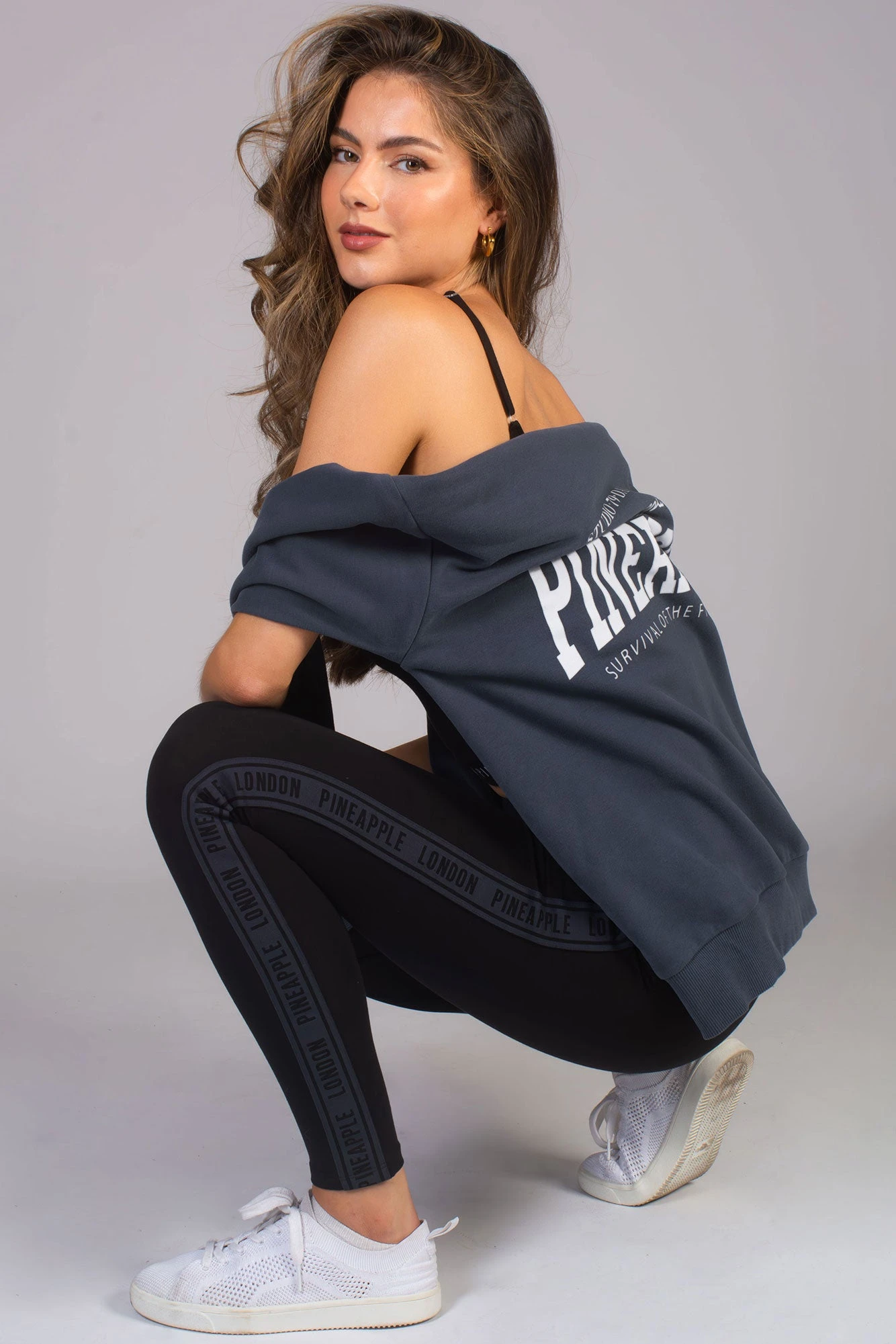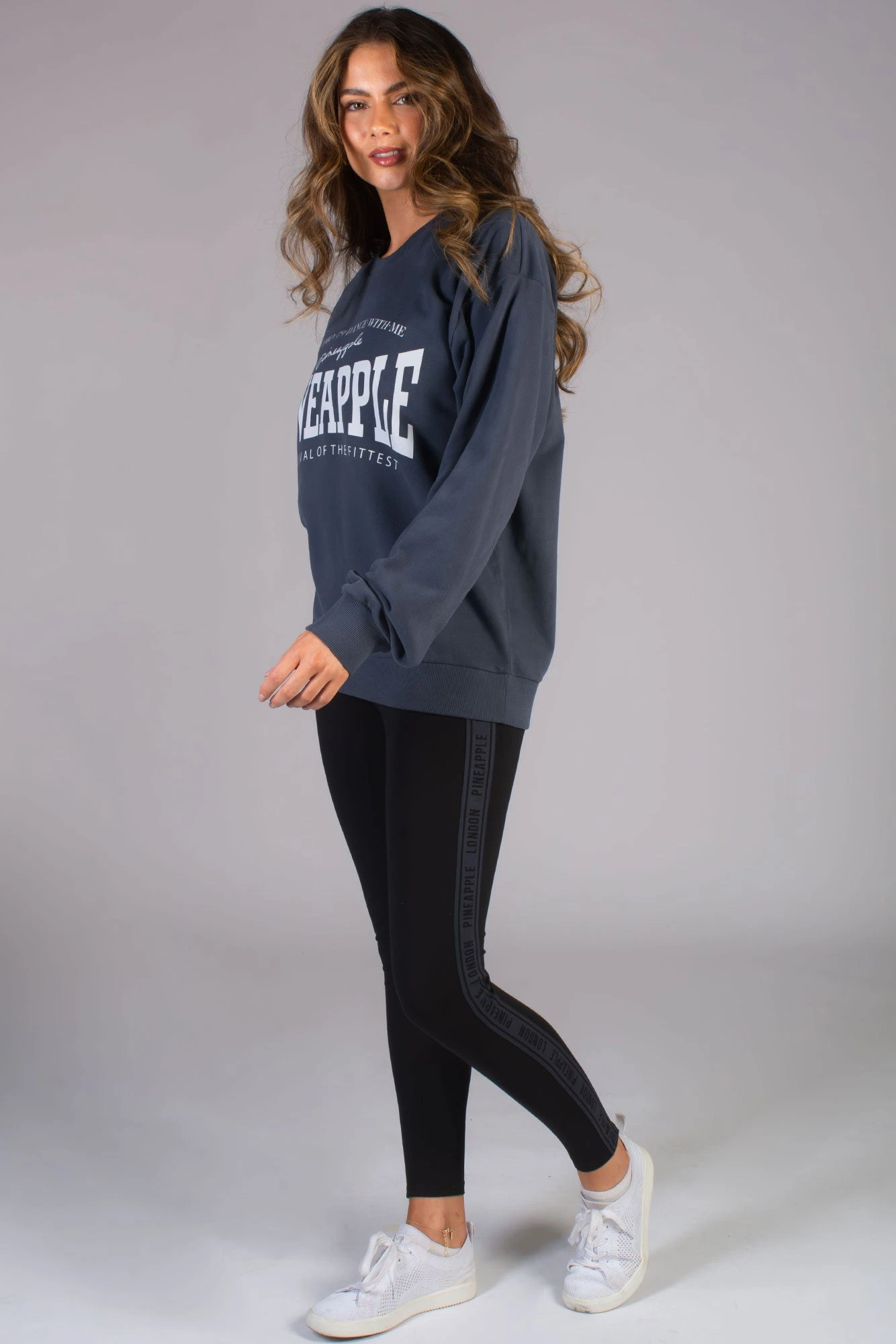 Classic signature Pineapple black leggings featuring a charcoal branded tape down the legs. These gym leggings are made in our soft and stretchy cotton blend. Wear with matching charcoal oversized sweatshirt.