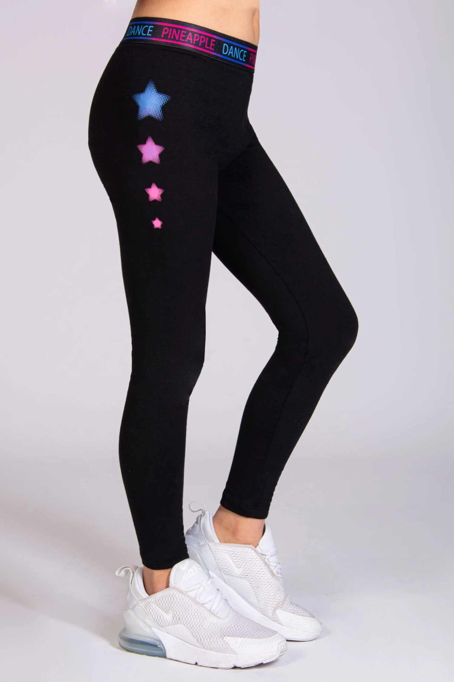 Everyone is a dancing star in these The Next Step leggings for girls. Made in our stretchy cotton rich fabric that is comfy, breathable and easy to wear all day long. Featuring soft ombre tape waistband for a secure fit and ombre star prints running along the leg inspired by TNS. These black dance leggings are perfect teamed back with a matching crop top or crop hoodie from our Pineapple x The Next Step Collection.Â