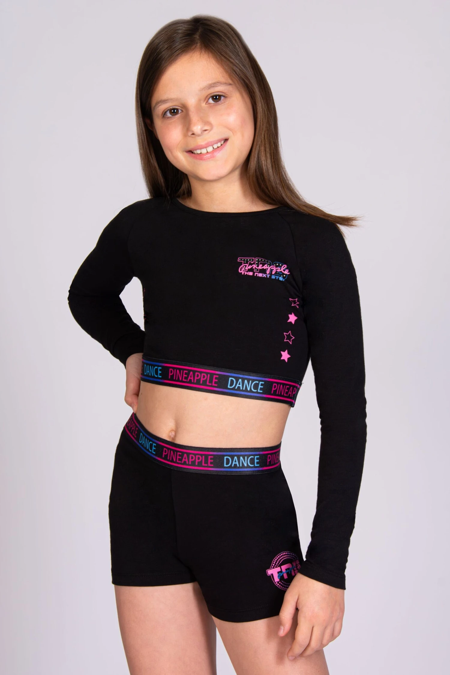 Dance like an A-Troupe in our black long sleeve crop top which features a soft ombre tape hem for a secure and comfy fit. Complete with star print along the side seam, an ombre The Next Step logo print on one sleeve and the chest. Complete your outfit with the matching tape star leggings!